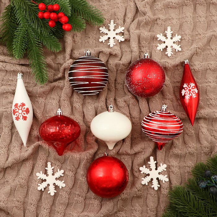 Новогодние шары «Морозный день» — это яркий и уютный набор для украшения ёлки в преддверии праздника. В комплекте 22 пластиковые игрушки в красно-белой гамме с рисунком, выполненные в разных формах, но объединённые стилем скандинавского уюта и советской новогодней традиции. Это выбор тех, кто любит создавать атмосферу зимнего настроения дома.
