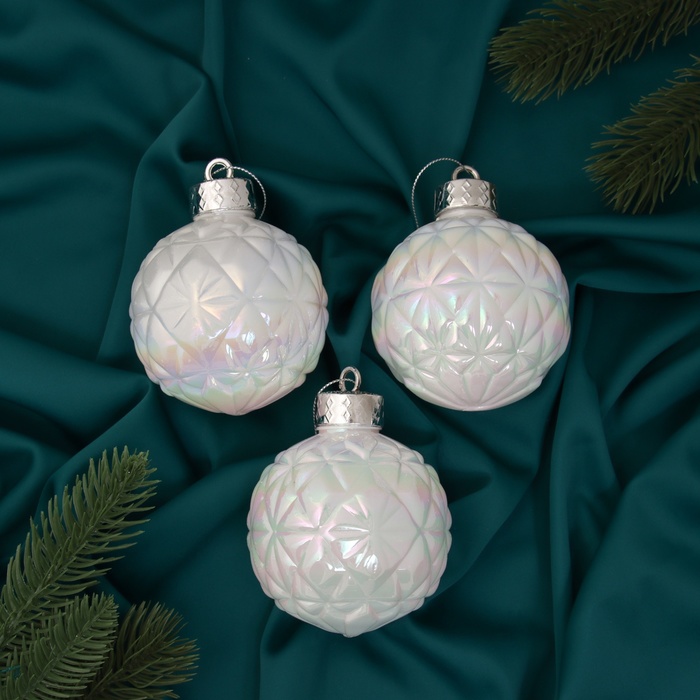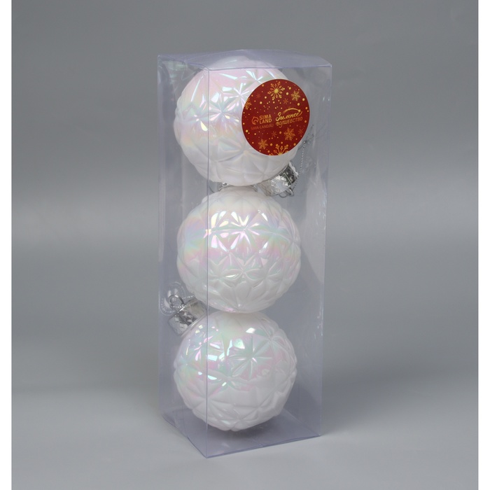 Набор из трёх белых перламутровых шаров диаметром 8 см с сетчатой текстурой сочетает лаконичность датского и скандинавского стилей с классической новогодней атмосферой. Пластиковые украшения создают нежный и стильный акцент в праздничном декоре.
