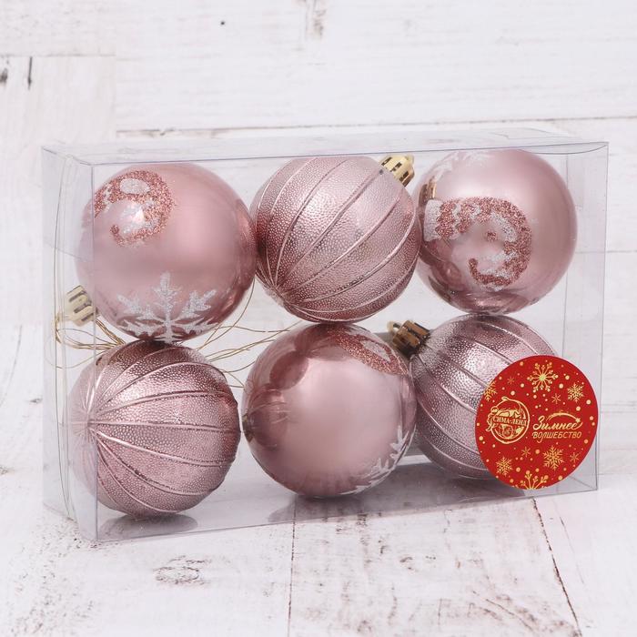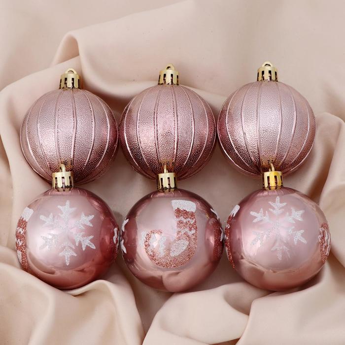 Новогодние шары розового цвета — это мягкий, но яркий акцент для праздничной ёлки в стиле шебби-шик. Шесть пластиковых игрушек диаметром 6 см станут универсальным решением для создания уютного и романтичного настроения зимнего торжества. Однотонный фон с контрастным рисунком добавляет декору индивидуальности и делает каждую игрушку особенной.