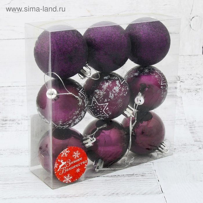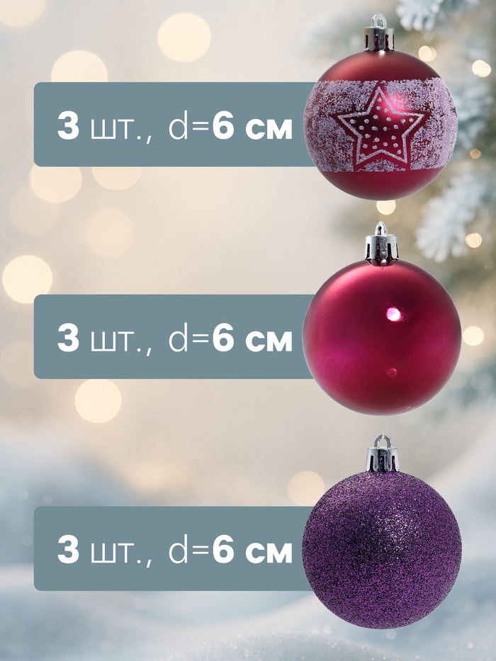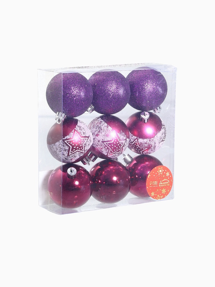 Эмоции и призыв к действию Подарите себе и своим близким истинное новогоднее чудо с яркими фиолетовыми шарами! Эти игрушки создадут волшебную атмосферу и произведут неизгладимое впечатление. Сделайте свой праздник ещё ярче и красивее, выбирая доступные и стильные решения для вашего дома. КомплектацияНабор шаров - 9 штук. Комментарии к товару