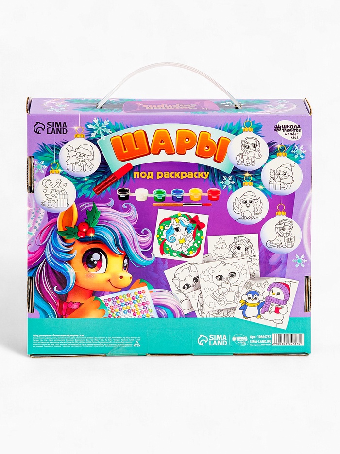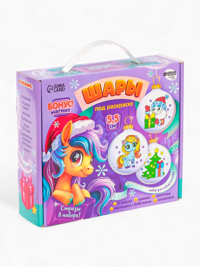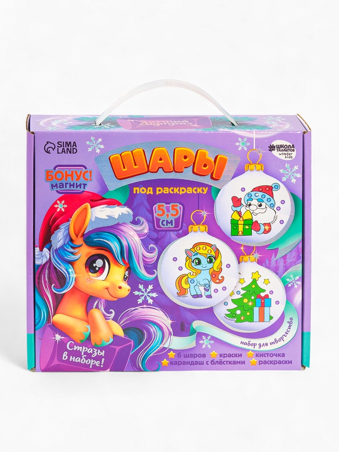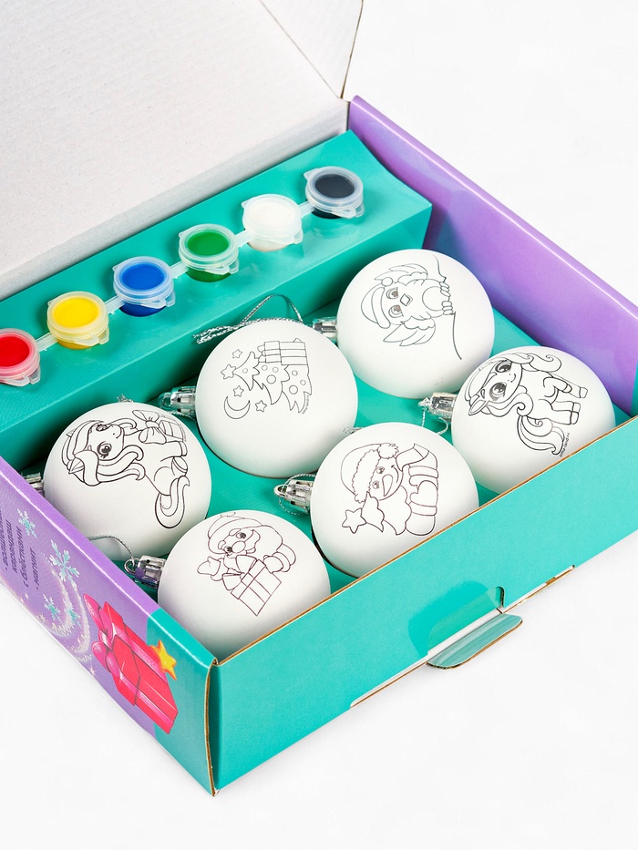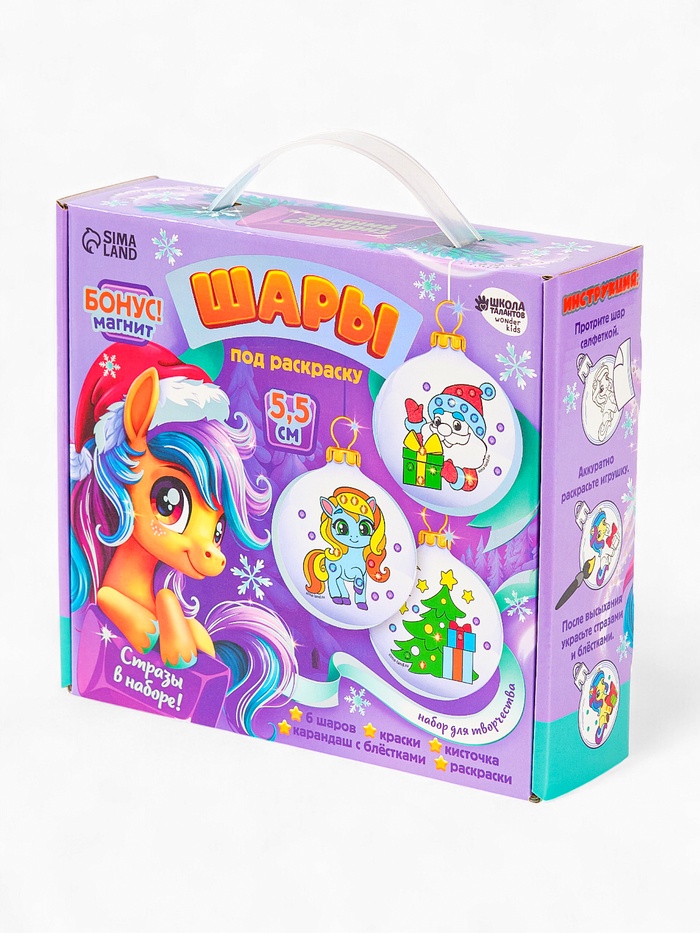 Габариты: 22,5 x 6,5 x 20,5 Страна: Китай В боксе: 36 шт Состав: Бумага, магнитная лента, пластик, краска, кисть Материалы: бумага, магнитная лента, пластик, краска, кисть Фасовка: по 1 шт Индивидуальная упаковка: Цветная картонная коробка Габариты товара: 22,2 см × 19,7 см × 6,3 см Сертификат: Не подлежит сертификации Набор: Да Символ года: Символ года 2026 (Лошадь) Тематика праздника: Новый год Материал: Пластик Вид: По пластику Возраст: Для детей Вид заготовки: Ёлочное украшение Комплектация набора: С красками, Со стразами Этот набор - отличный повод провести волшебный вечер в кругу семьи!Предложите малышу создать своими руками уникальные украшения для вашей ёлочки. В наборе шары с нанесённым рисунком. Вам остаётся лишь проявить фантазию и раскрасить их на свой вкус. Набор шаров также станет прекрасным подарком друзьям и близким. Комплектация