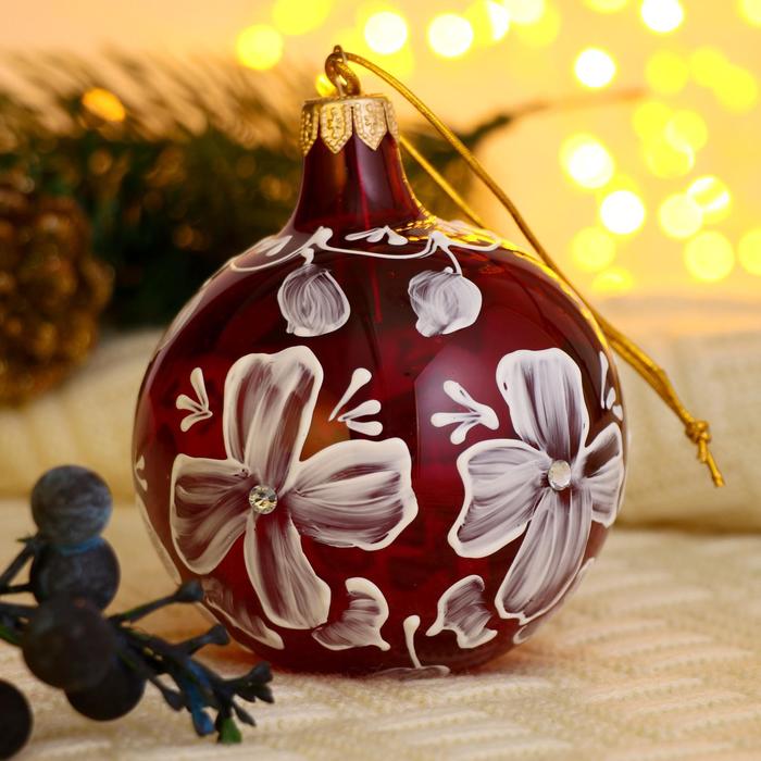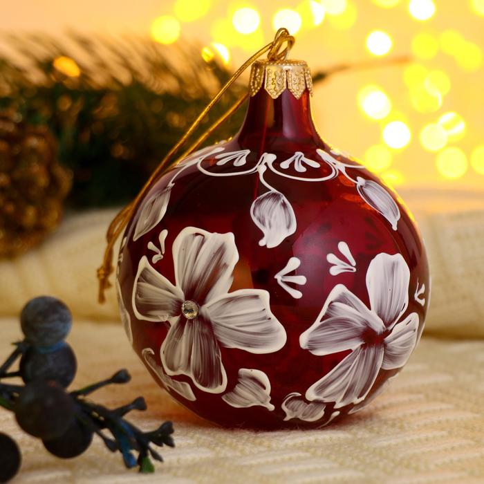 Этот бордовый шар с белыми незабудками — воплощение тихой зимней сказки. Каждый мазок ручной росписи хранит тепло мастера, превращая ёлку в историю о уютном празднике.