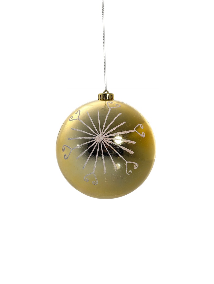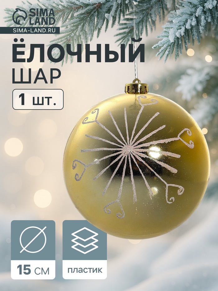 Пластиковый новогодний шар золотистого цвета с рисунком — это крупный праздничный акцент для тех, кто хочет добавить ёлке тепла и света. Игрушка диаметром 15 см выполнена в классической форме и украшена узором, который подчёркивает её торжественность. Украшение подходит под стили ар-деко, барокко и строгой классики — идеально для создания центрального элемента на дереве.