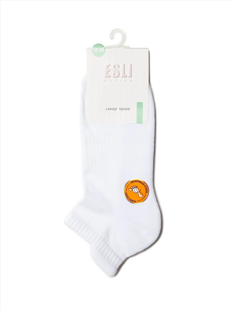 Производитель: ESLI; Российский размер: 23; Артикул поставщика: ACTIVE (короткие, махр. стопа); Состав: хлопок 78%, полиэстер 16%, эластан 5%, полиамид 1%; Год: 2021; Страна: Беларусь Укороченные спортивные женские носки из хлопка, с махровой стопой, резинка с "язычком", с рисунками.