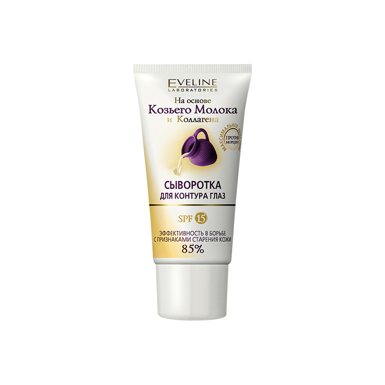 Новейшая СЫВОРОТКА ДЛЯ КОНТУРА ГЛАЗ от ЭВЕЛИН, создана на основе целебного КОЗЬЕГО МОЛОКА, КОЛЛАГЕНА и новейших достижений технологии. Препарат имеет легкую текстуру, которая быстро впитывается и не оставляет ощущения стянутости. Сыворотка способствует восстановлению и повышению эластичности и упругости нежной кожи вокруг глаз. Эффективно разглаживает мимические морщинки вокруг глаз. Устраняет отечность и темные круги под глазами.