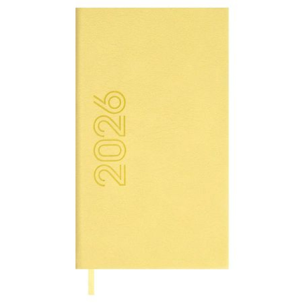 Еженедельник датированный 2026 ESCALADA, 85х145 мм, 64 л., арт. 70363/ 40 ЛОЗАНЖ ЖЁЛТЫЙ (кожзам: твёрдый переплёт, материал обложки: искусственная кожа "Лозанж"; декор: блинтовое тиснение; способ крепления блока: ниткошвейный; вн. блок: 64 л., белый офсет 70 г/м?, печать в две краски (линия), справочный материал: есть; перфорация углов блока: нет; закладка/-и: одно ляссе; каптал: есть; форзац: без печати; персонализация возможна: да; индивидуальная упаковка: ПЭТ-пакет)