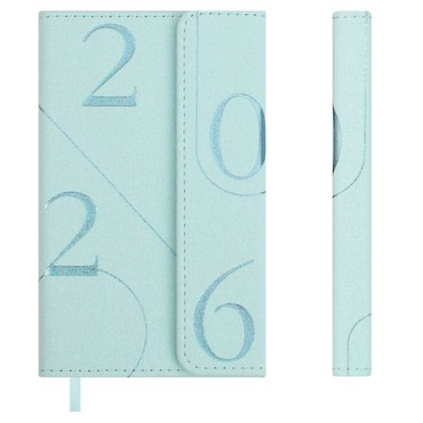 Еженедельник датированный 2026 ESCALADA, 95х155 мм, 64 л., арт. 70354/ 40 БЬЯНЧИНИ МЯТНЫЙ (кожзам: твёрдый переплёт, материал обложки: искусственная кожа "Бьянчини"; декор: тиснение фольгой; способ крепления блока: ниткошвейный; вн. блок: 64 л., белый офсет 70 г/м?, печать в две краски (линия), справочный материал: есть; перфорация углов блока: нет; закладка/-и: одно ляссе; каптал: есть; форзац: без печати; особенности: магнитный клапан; персонализация возможна: нет; индивидуальная упаковка: ПЭТ-пакет)