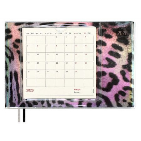 Еженедельник датированный 2026 ESCALADA, 180х127 мм, 64 л., арт. 70348/ 20 ЛЕОПАРД СЕРЫЙ ( ПВХ: мягкий переплёт, съёмная обложка, материал обложки: ПВХ, металлизированная бумага, декор: печать полноцветная, вставной блок, ниткошвейный; вн. блок: 64 л., кремовый офсет 70 г/м?, печать в две краски (линия), справочный материал: есть; перфорация углов блока: нет; закладка/-и: два ляссе, каптал: нет; печать форзаца: печать в одну краску, персонализация возможна: нет; особенности: карман на лицевой части обложки с ежемесячным планировщиком на год, петля для ручки; персонализация возможна: нет; индивидуальная упаковка: «бандероль» + ПЭТ-пакет)