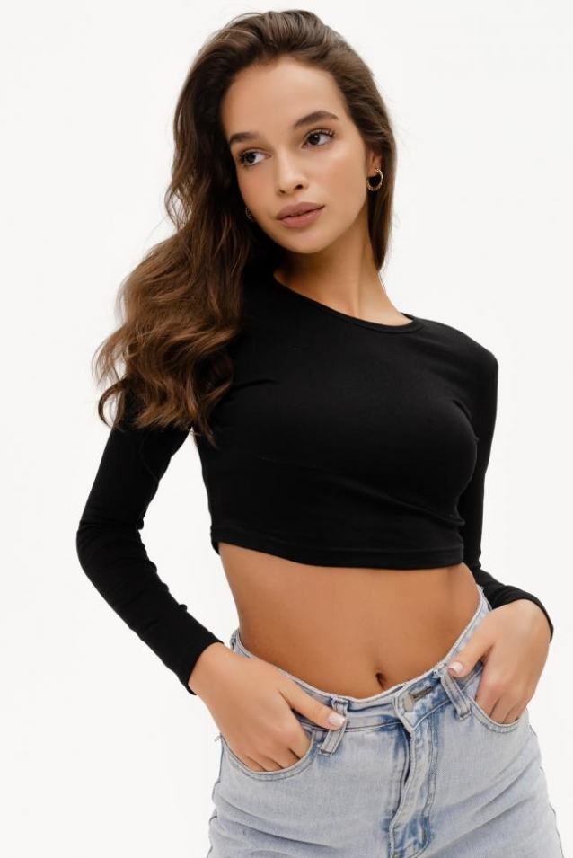 F-Лонгслив-1 женский укороченный кроп топ с длинными рукавами (Черный)