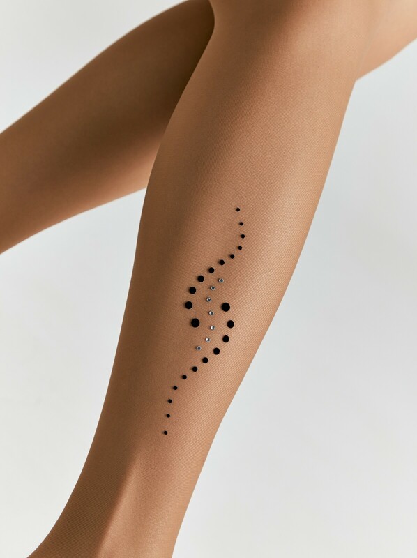 Тонкие эластичные женские колготки 20 ден с усиленным торсом в виде шортиков, с термоаппликацией из флока и страз, расположенной на щиколотке одной ноги, плоский шов, хлопковая ластовица, укрепленный мысок.