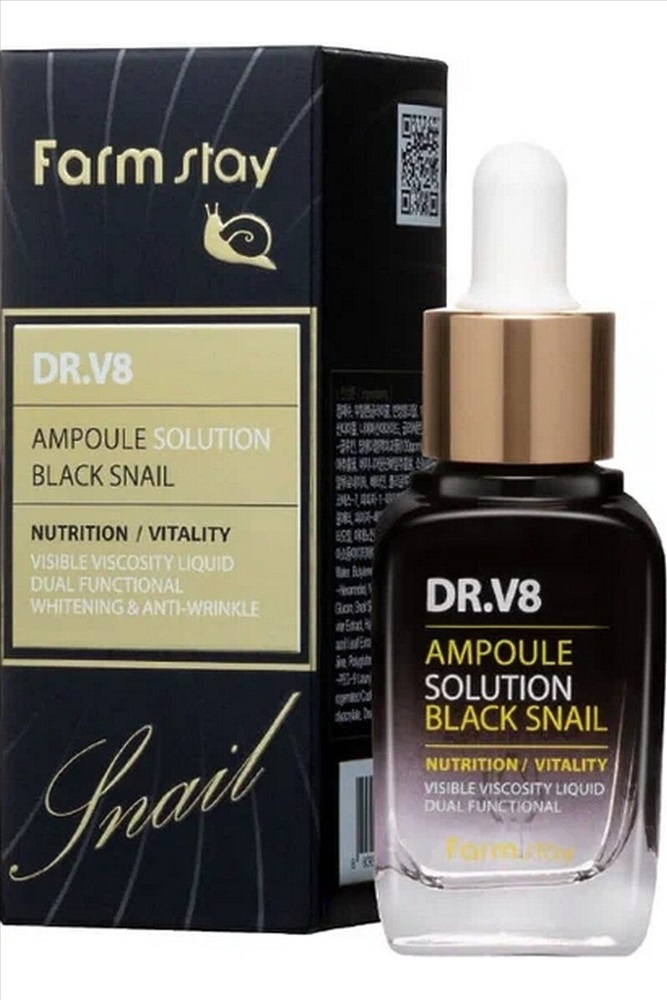 Farmstay DR-V8 Ampoule Solution Black Snail Интенсивное средство с муцином улитки оказывает увлажняющее и питательное, успокаивающее и смягчающее, а также выраженное антивозрастное действие, способствует осветлению пигментации и разглаживанию морщин. Ключевой компонент сыворотки - муцин чёрной улитки, который позволяет добиться потрясающих результатов, так как запускает процессы омоложения, воздействуя на кожу на клеточном уровне и стимулируя активность фибробластов. Эти процессы способствуют синтезу коллагена, эластина, а также гиалуроновой кислоты, что приводит к интенсивному насыщению кожи влагой, повышает ее эластичность, способствует разглаживанию морщин и осветлению пигментации. Способность улиточного муцина минимизировать воздействие свободных радикалов обеспечивает защиту кожи от преждевременного увядания. Кроме того, улиточный муцин воздействует на воспалительные процессы кожи, ускоряет их заживление, предупреждает появление акне и раздражений, способствует рассасыванию застойных явлений, оздоравливает кожу. Способ применения: Нанести сыворотку на очищенную кожу легкими массирующими движениями. Cocтав: Water, Butylene Glycol, Alcohol Denat, 1,2-Hexanediol, Niacinamide, Glycerin, Beta-Glucan, Snail Secretion Filtrate (100ppm), Caviar Extract, Hamamelis Virginiana (Witch Hazel) Leaf Extract, Sodium Hyaluronate, Betaine, Polyglutamic Acid, Coceth-7, PPG-1-PEG-9 Lauryl Glycol Ether, PEG-40 Hydrogenated Castor Oil, Adenosine, Sodium Polyacrylate, Disodium EDTA, Fragrance.