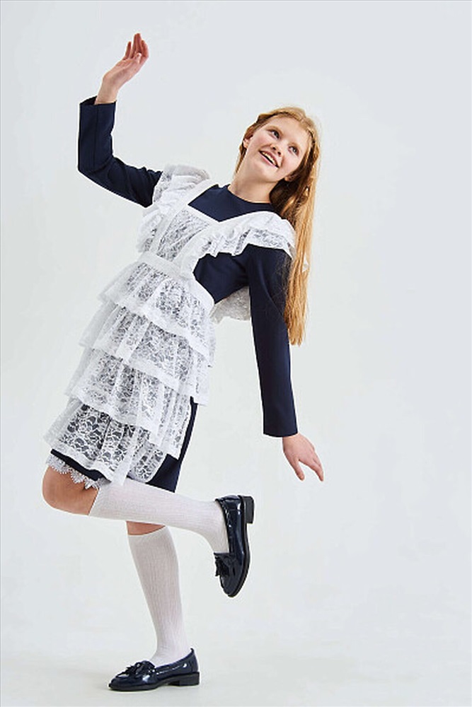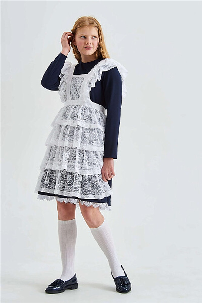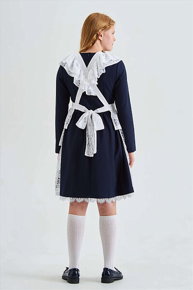 Нарядный фартук из гипюра. Грудка фартука двойная. Верх грудки обработан отрезной планкой. Бретели и пояс состоят из двух частей: верхний слой из гипюра, нижний - из хлопчатобумажной ткани. К бретелям притачаны двойные крылышки. Сзади бретели перекрещиваются. ЮБка фартука состоит из 4 рядов присборенных воланов. По талии фартук регулируется поясом, который завязывается на бант сзади.