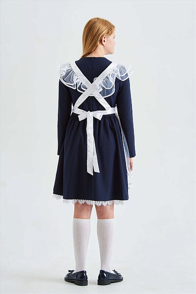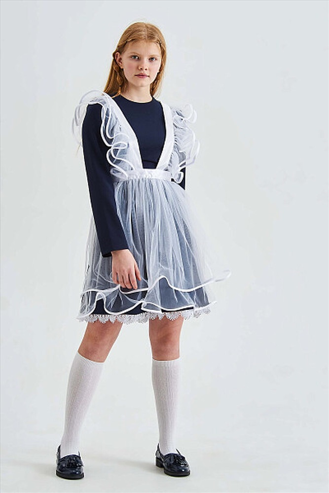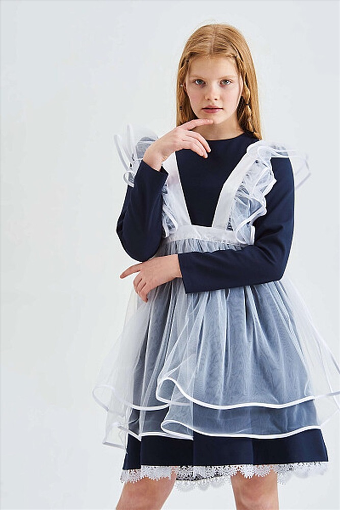 Нарядный фартук для девочек выполнен из мягкой сетки, бретели и пояс атласные. К бретелям притачаны крылышки на сборке, каждое из которых состоит из 2-х деталей (верхнее и нижнее крылышко). Края крыльев окантованы атласной лентой. Сзади бретели перекрещиваются. Юбка состоит из 2-х деталей (верхняя и нижняя юбка). Низ и боковые срезы каждой юбки отделаны атласной лентой. Обе юбки собраны на сборку на талии. По талии фартук регулируется поясом, который завязывается на бант сзади.