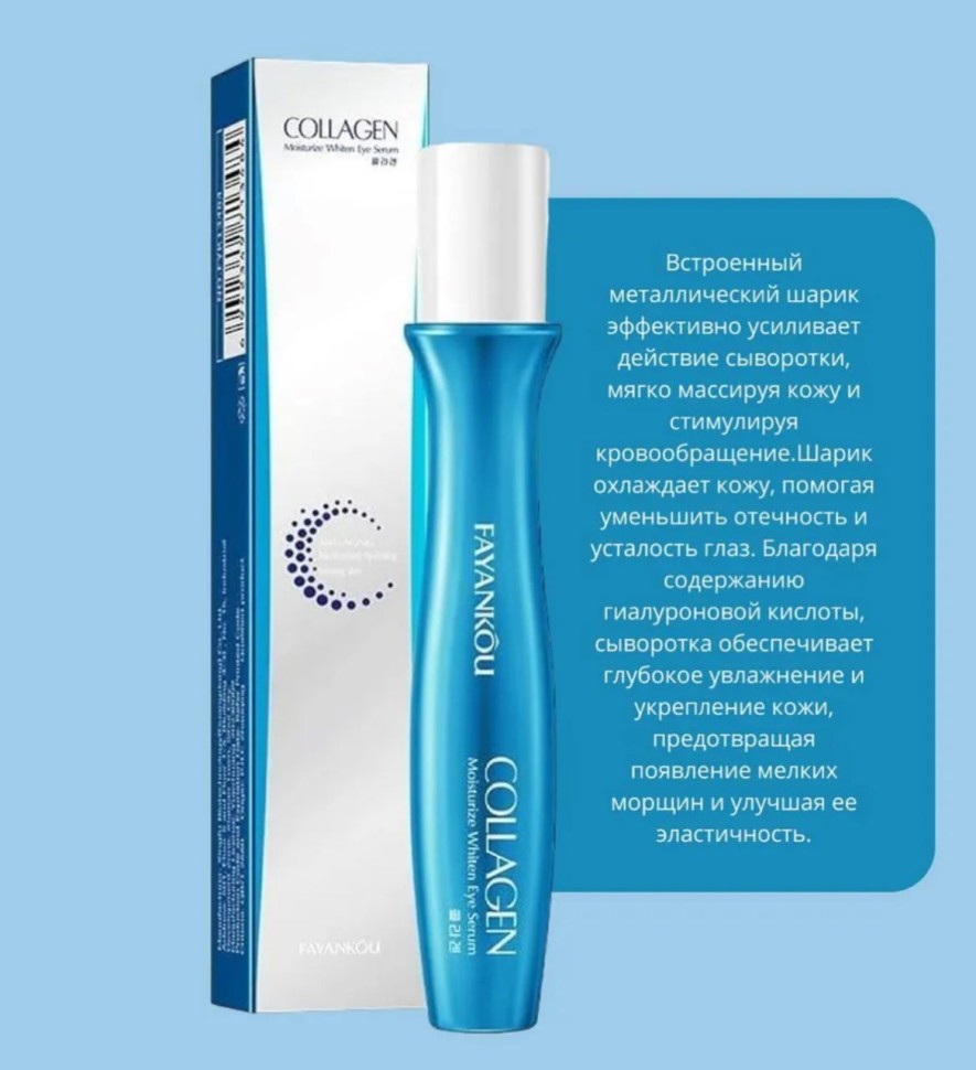 Сыворотка с роллером для кожи вокруг глаз с коллагеном - это инновационное средство, разработанное для интенсивного увлажнения и ухода за нежной кожей вокруг глаз. Встроенный металлический шарик эффективно усиливает действие сыворотки, мягко массируя кожу и стимулируя кровообращение. Шарик охлаждает кожу, помогая уменьшить отечность и усталость глаз. Благодаря содержанию гиалуроновой кислоты, сыворотка обеспечивает глубокое увлажнение и укрепление кожи, предотвращая появление мелких морщин и улучшая ее эластичность.