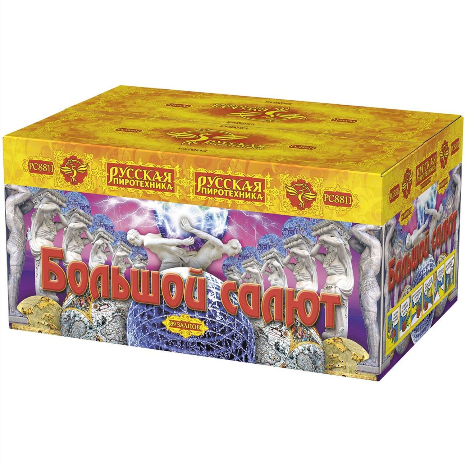 Калибр: 1.2 " Залпы: 99 Время работы: До 100 сек Высота фейерверка: До 50 м Особенности фейерверка: Выраженный финал, Звуковые эффекты Эффекты фейерверка: Трещащие облака, Огни, Искристая ива, Комета, Рыбки, Разноцветный букет, Пион, Парчовая корона, Опадающие листья, Мерцание, Шуршащие паучки Цвет: Красный, Белый, Синий, Золотой, Серебряный, Зеленый Праздник: Новый Год, Юбилей, День Рождения, Свадьба Размеры упаковки, мм: 550 х 310 х 270 Вес изделия, кг: 15.900 Фасовка: штука Число эффектов: 11 Описание: "Большой салют" - сложно вообразить более простое и говорящее за себя название! Это, действительно, очень большой - и при этом очень красивый - салют! Главный эффект фейерверка - сферы из крупных и ярких красных и зеленых звезд с перламутровым (мерцающим) эффектом. Звездные сферы перемежаются другими эффектами в различных комбинациях. Среди этих ффектов - серебряные форсы (т.е. хвосты из шипящих искр, как у наземных салютов); затейливые, летающие по странным траекториям маленькие кометы-швермеры; облака белых искр; стайки серебряных рыбок, которые словно плавают по небу, прежде чем мягко потухнуть; букетики синего и красного цвета, которые плавно взлетают, а затем опускаются к земле. Независимо от того, для какой цели Вы покупаете фейерверк, "Большой салют" станет удачным выбором, о котором не придется жалеть - ведь в нем собраны только самые лучшие эффекты из ассортимента "Русской пиротехники". Эффекты: 1. Разноцветные кометы, мерцающие трассы разрываются сферами из зелёных мерцающих и красных огней с серебряными форсами в центре. 2. Белых мерцающих и красных огней с серебряными форсами в центре. 3. Золотых форсов с серебряными, трещащими искрами. 4. Красных и зелёных огней, с синими и белыми разбегающимися огоньками в центре. 5. Красных мерцающих огней. 6. Зелёных мерцающих огней. 7. Красных огней и искристых трещащих форсов. 8. Серебряных форсов. 9. Трещащих огней (залпы). 10. Букетики из синих и красных огней,. 11. Букетики из белых разбегающихся огоньков. Комментарии к товару