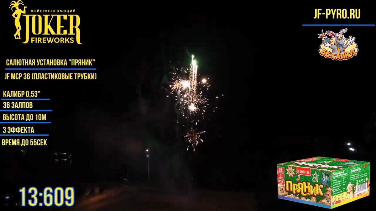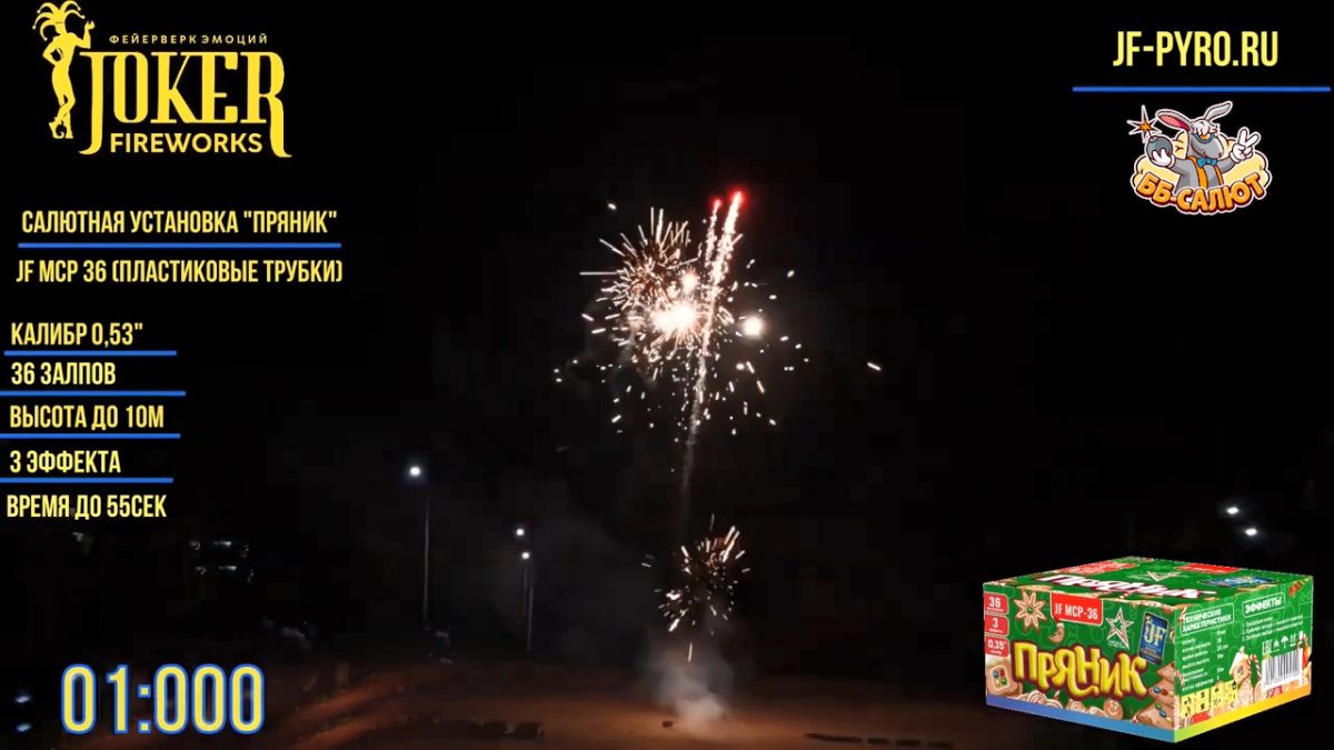 Фейерверк Пряник набирает высоту 10 метров и включает в себя 36 залпов. Зрители смогут насладиться красной и зеленой звездой с пышной кометой. При каждом залпе высоко в небо взлетают змейки, которые сопровождаются ярким и веселым потрескиванием. Это десятки искр серебристого цвета, вспыхивающие на темном фоне ночного неба. А похожи они на самые настоящие то возникающие, то исчезающие пряники. Хлопки, треск, яркие искры - это то, что нужно, чтобы вечер стал веселым!