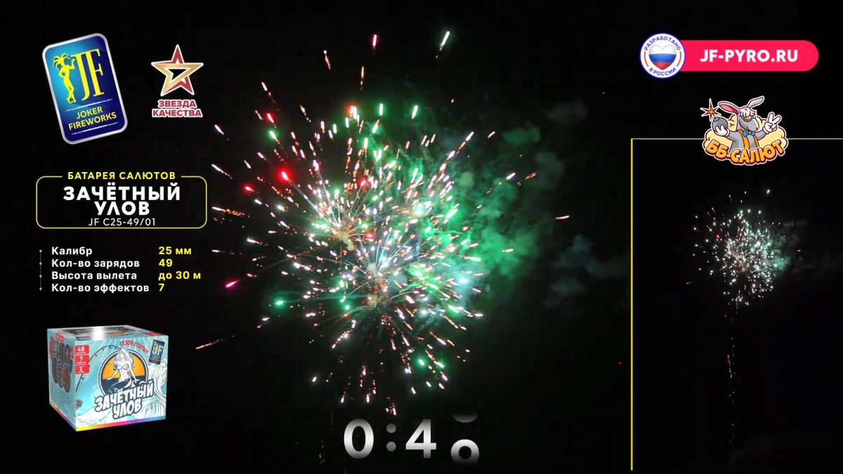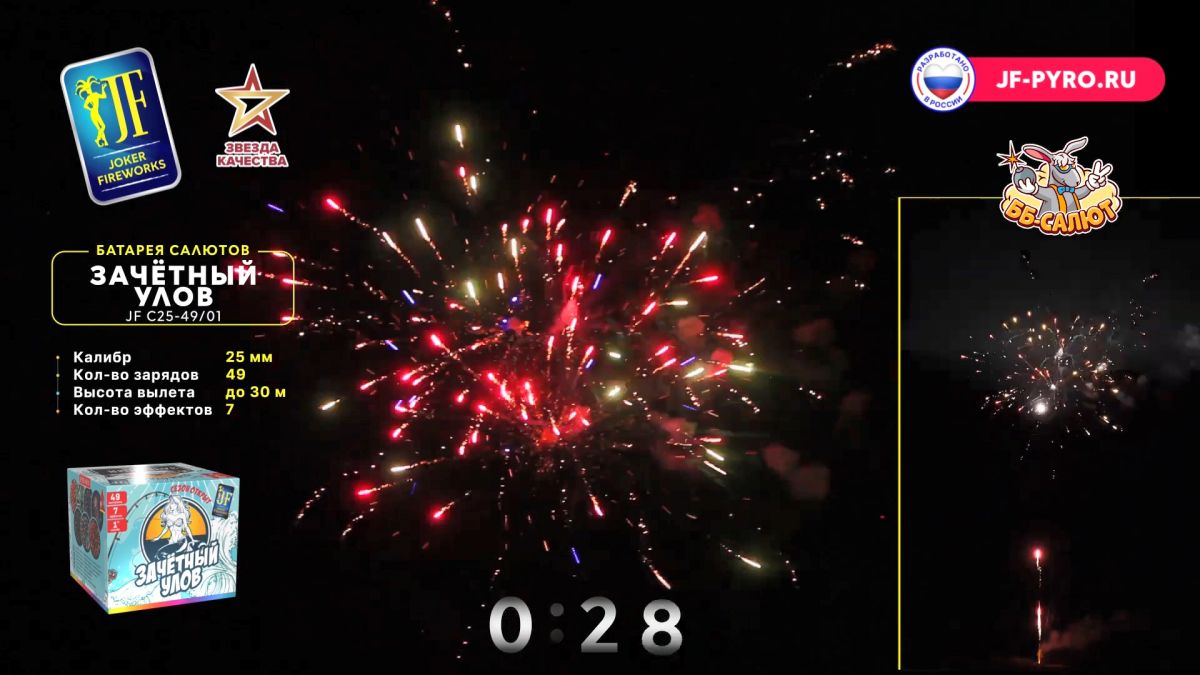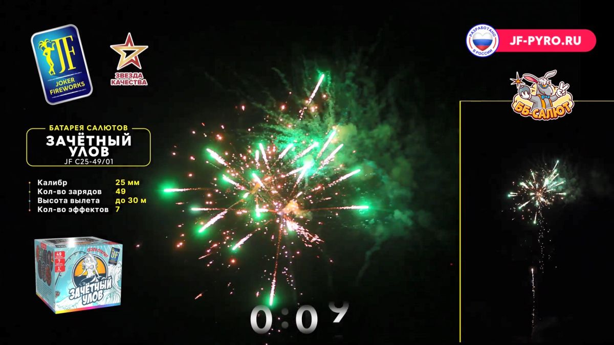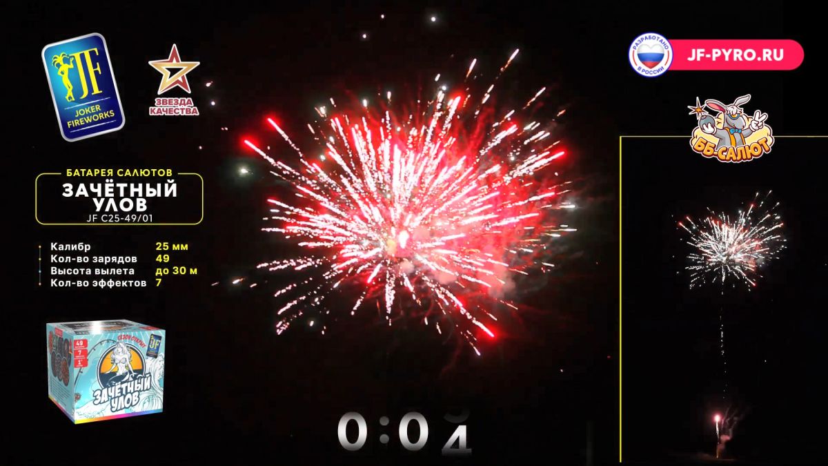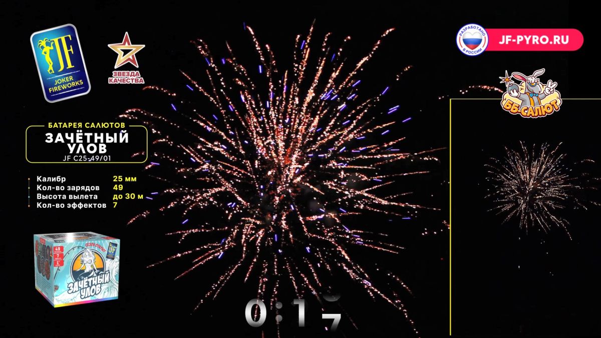 1. Красная волна с белым мерцанием и красной кометой. 2. Зеленая волна с золотым мерцанием и зеленой кометой. 3. Золотая корона с синими звездами и синей кометой. 4. Цветная георгина с треском и красной кометой. 5. Золотая корона с белым мерцанием. 6. Цветной пион с белым мерцанием. 7. Красная волна с треском и красной кометой.