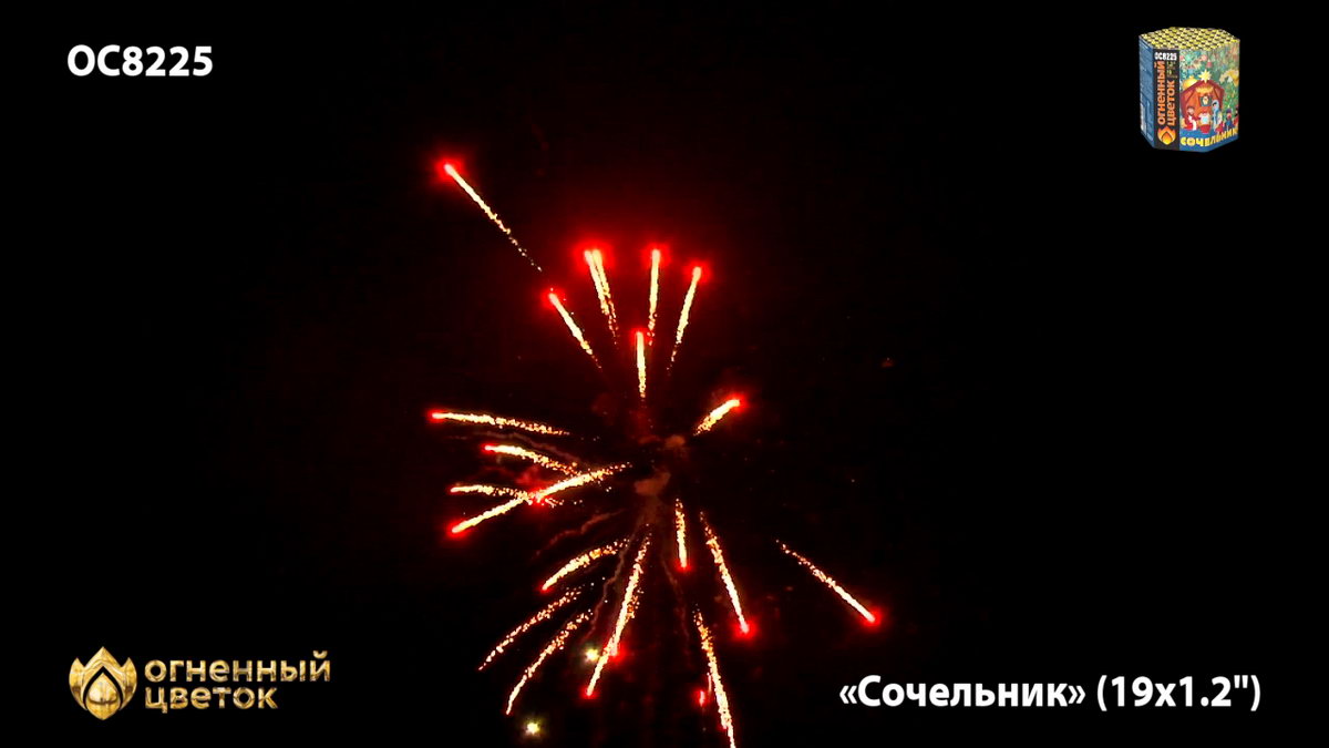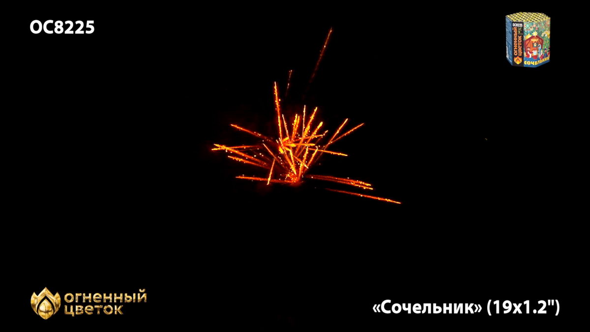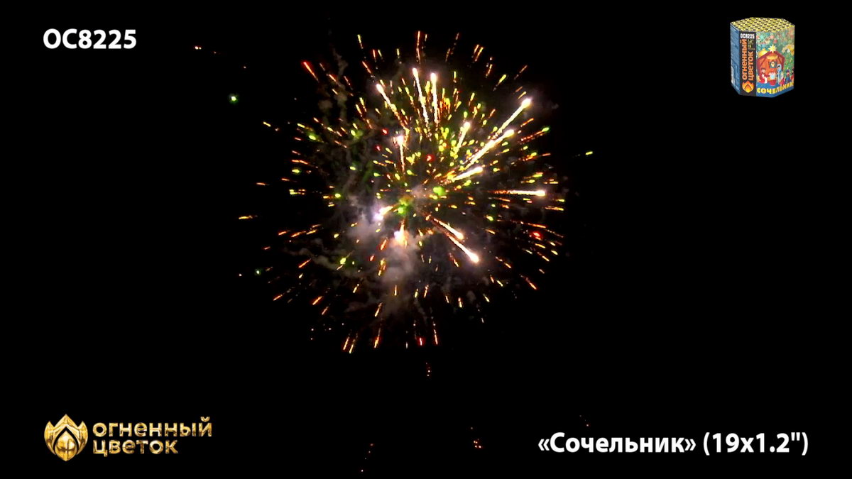 1. Разноцветные кометы разрываются сферами из: серебряных форсов с красными огнями на концах и трещащих огней. 2. Серебряные форсы, мерцающие красные и зелёные огни. 3. Золотые мерцающие форсы с искрами. 4. Золотые искристые форсы и синие огни.