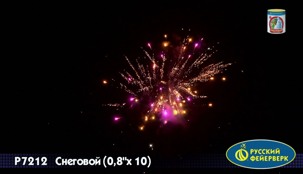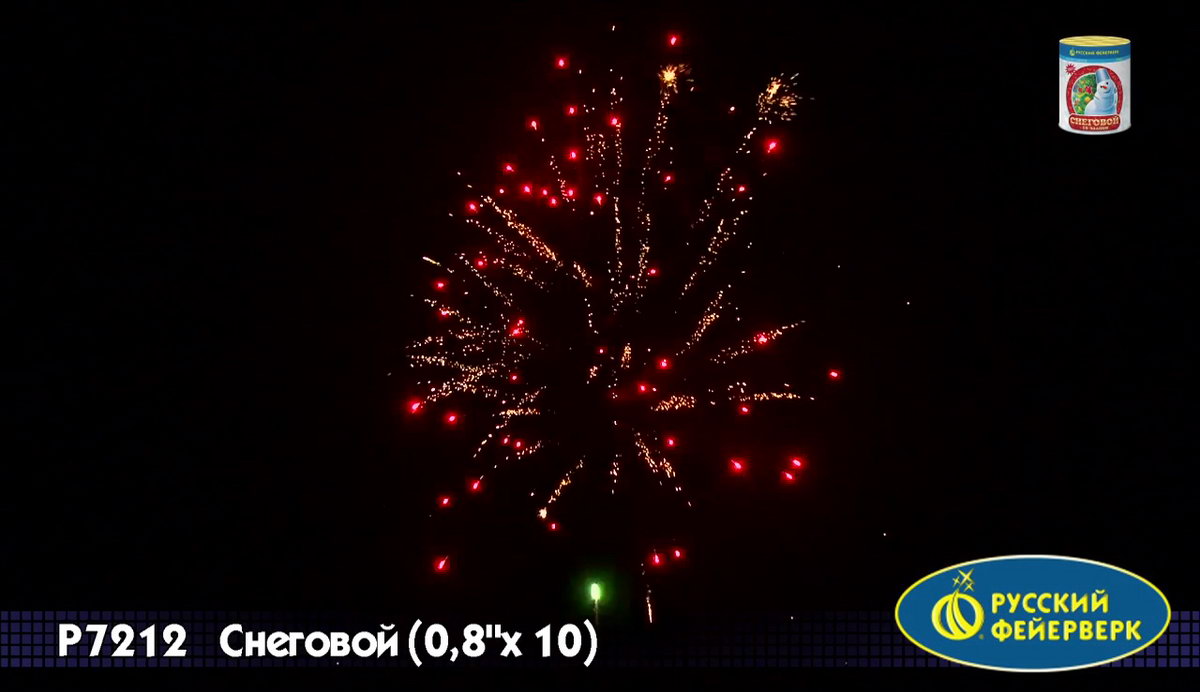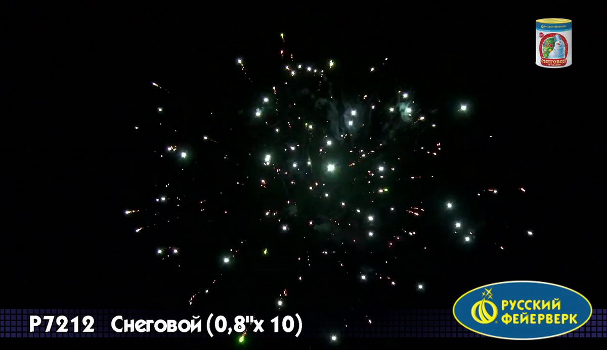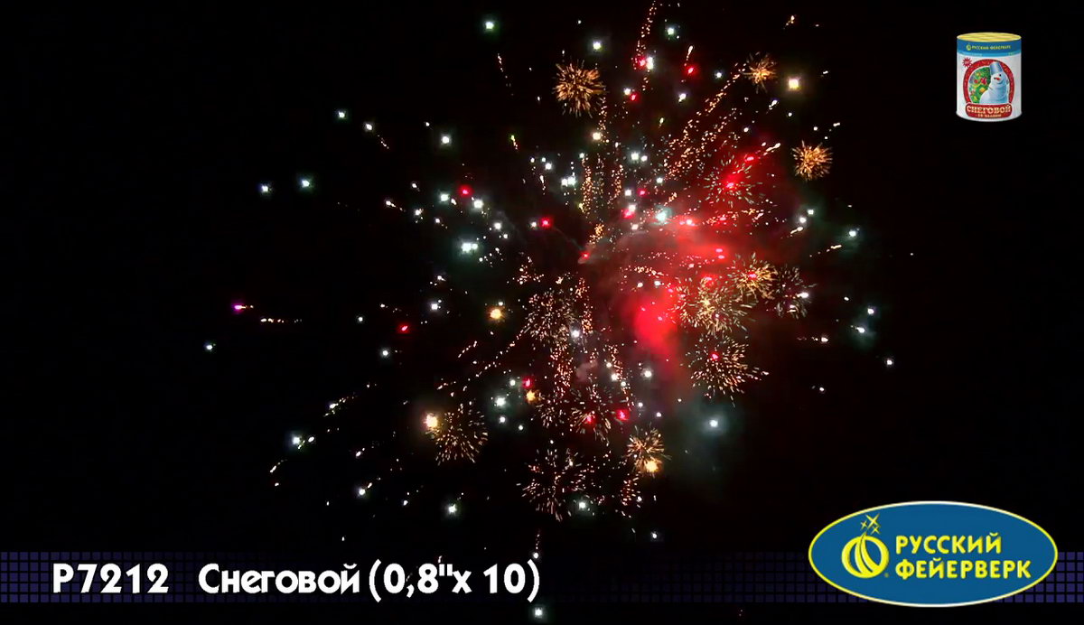 1. Красная сфера (пион) и облако трещащих разрывов (трещащая хризантема). 2. Зелено-фиолетовая сфера (пион) и белое мерцание. 3. Фиолетово-желтая сфера (пион) и облако трещащих разрывов (трещащая хризантема). 4. Множество серебряных ниспадающих нитей (парча) и зеленое мерцание.