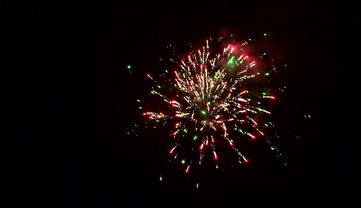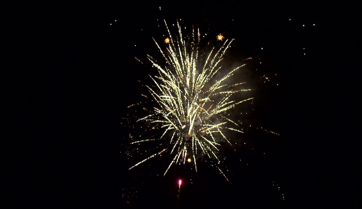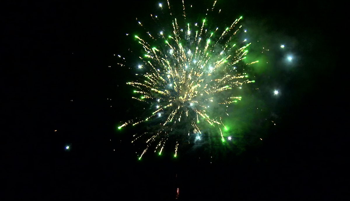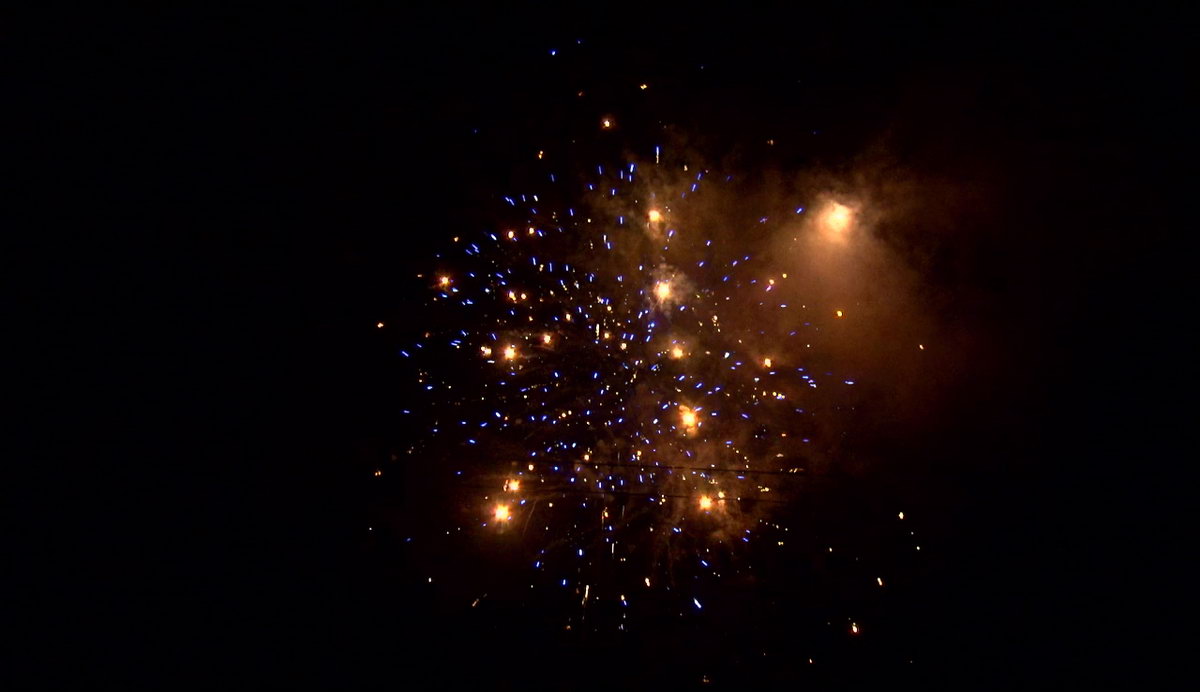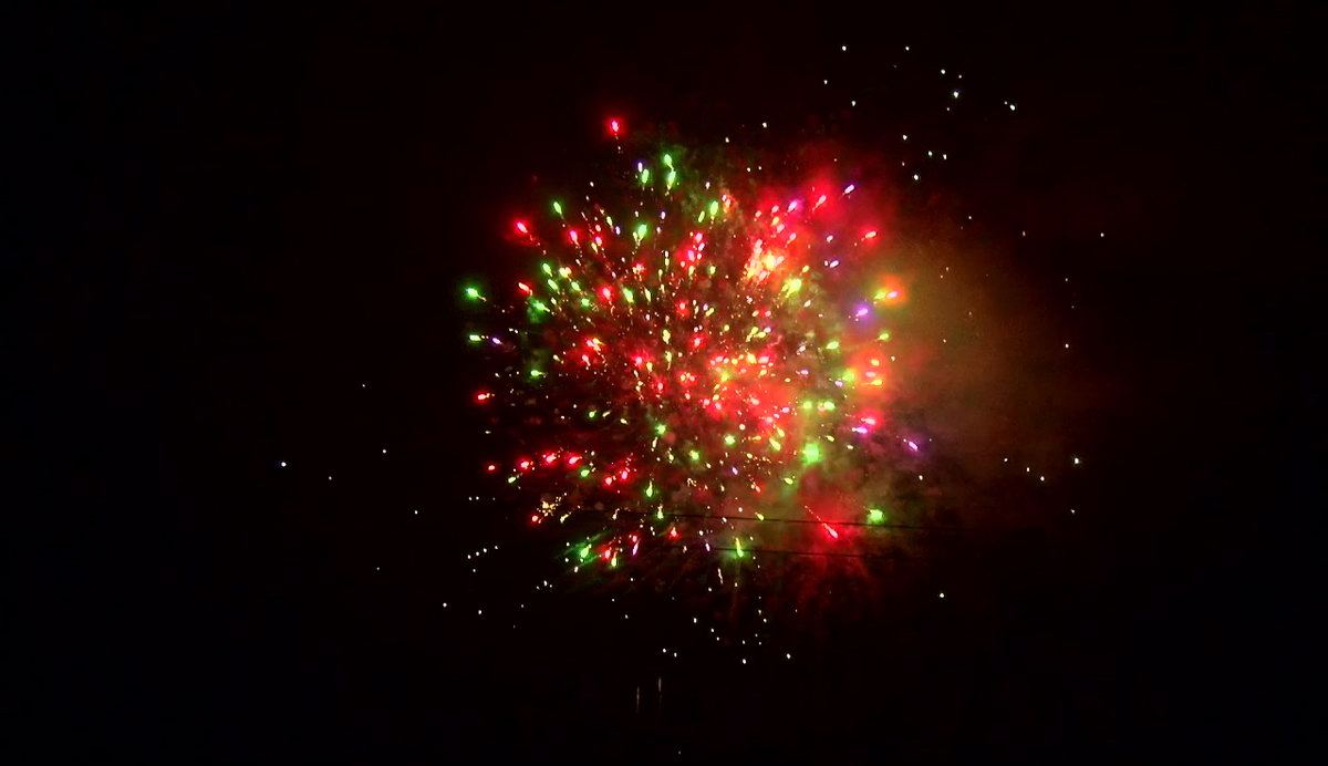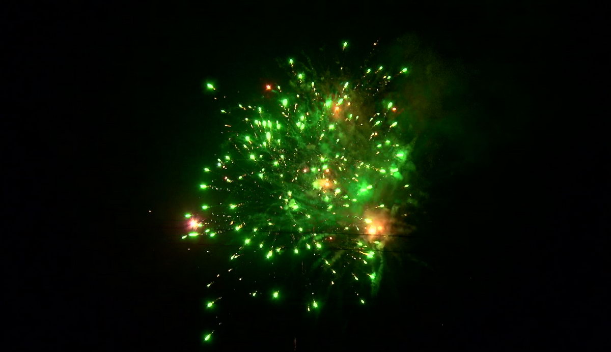 1. Красные звезды с пышными хвостами (кокос) и зеленое мерцание. 2. Зелено-золотая мерцающая сфера (пион). 3. Зеленые звезды с пышными хвостами (кокос) и белое мерцание. 4. Сине-золотая мерцающая сфера (пион). 5. Фиолетово-зелено-красная сфера (пион) и облако треска (трещащий дождь). 6. Множество серебряных ниспадающих нитей (парча) и облако треска (трещащий дождь). 7. Облако треска (трещащая хризантема).