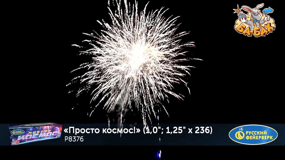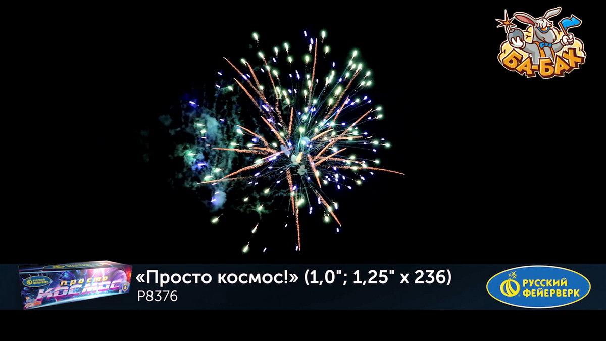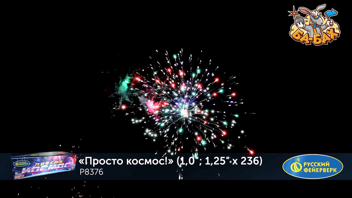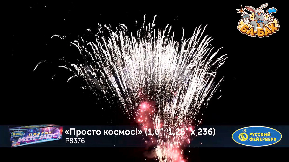 Калибр: 1.25, 1 " (разнокалиберный) Залпы: 236 Время работы: До 205 сек Высота фейерверка: До 55 м Эффекты фейерверка: Веер Цвет: Серебряный, Золотой, Фиолетовый, Синий, Зеленый, Белый, Красный, Желтый Размеры упаковки, мм: 235 х 860 х 370 Вес изделия, кг: 28.000 Фасовка: штука Число эффектов: 21 Эффекты: 1. Свист. 2. Множество серебряных ниспадающих нитей (парча). 3. Красные и зеленые букеты падающих огней (падающие листья). 4. Краснозелено-сине-фиолетовая сфера (пион) и белое мерцание. 5. Серебряные звезды с пышными хвостами (кокос) и красно-синяя сфера (пион). 6. Множество золотых ниспадающих нитей (парча) и облако треска (трещащая хризантема). 7. Веер - Серебряные хвосты, синие звезды и красное мерцание (бурак). 8. Серебряные шуршащие разлетающиеся кометы (паук), красное мерцание и зеленые звезды. 9. Золотые звезды с пышными хвостами (кокос) и синезеленая сфера (пион). 10. Красно-зеленые звезды с пышными хвостами (кокос) и облако треска (трещащий дождь). 11. Веер 2 уровня: вверху - красные кометы с пышными хвостами; внизу - треск. 12. Веер 2 уровня: вверху - зеленые кометы с пышными хвостами и серебряные хаотично разлетающиеся звезды (рыбки); внизу - треск. 13. Веер 2 уровня: вверху - желтые кометы с пышными хвостами и серебряные хаотично разлетающиеся звезды (рыбки); внизу - треск. 14. Сине-красно-зеленая мерцающая сфера (пион). 15. Золотые мерцающие хвосты (мерцающая ива) и фиолетово-зеленая сфера (пион). 16. Зототые трещащие хвосты (трещащая ива), красные звезды и облако треска (трещащая хризантема). 17. Веер W: по сторонам - трещащие кометы с пышными хвостами и красные букеты падающих звезд (падающие листья); посередине - серебряные хаотично разлетающиеся звезды (рыбки) и синие звезды. 18. Вертушка разрывается сине-зелено-золотой мерцающей сферой (пион). 19. Серебряные звезды с пышными хвостами (кокос) и красно-белое мерцание. 20. Свист. 21. Красочная концовка: ЗАЛП - золотые звезды с пышными хвостами (кокос) и облако треска (трещащая хризантема). Комментарии к товару