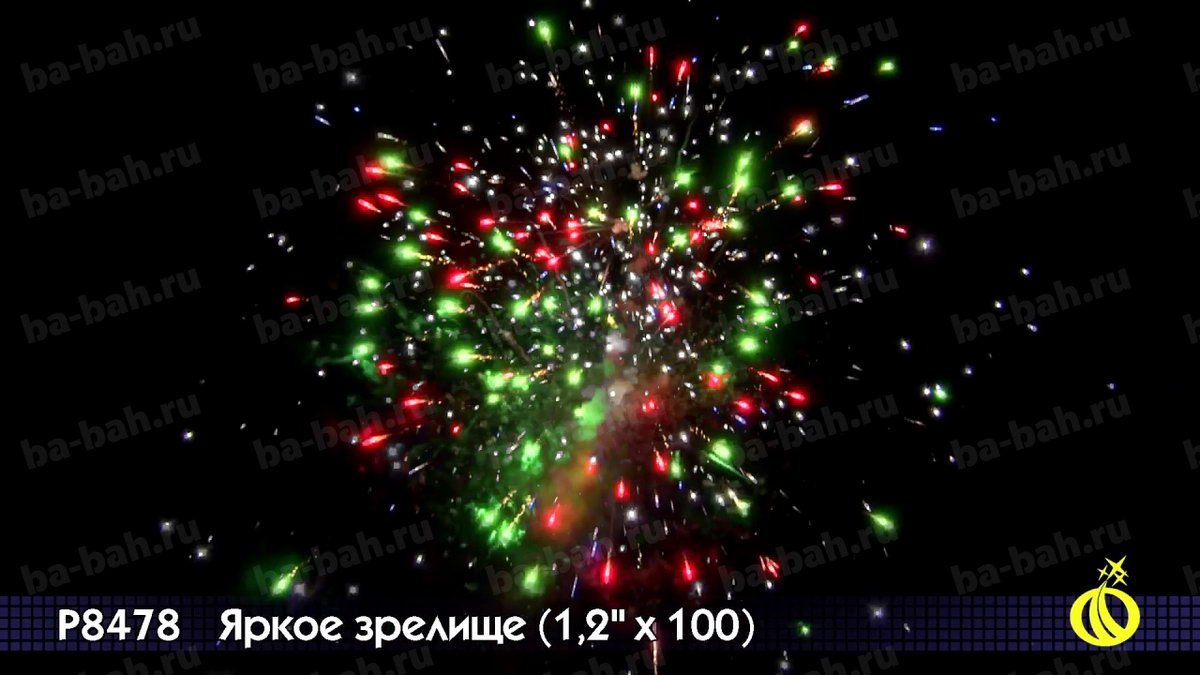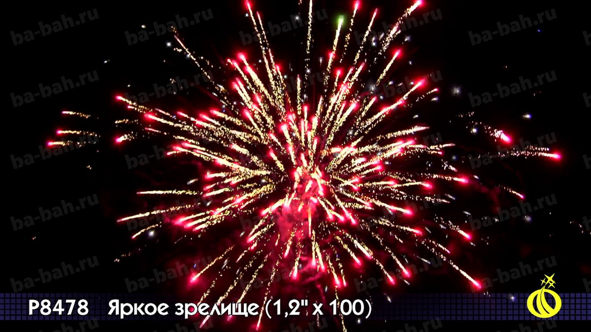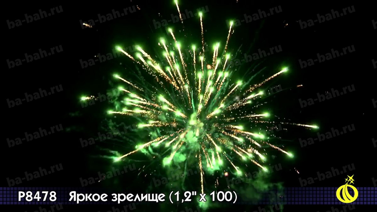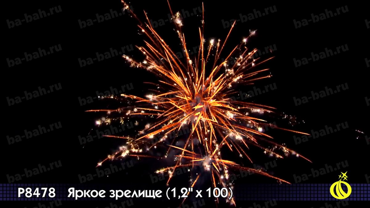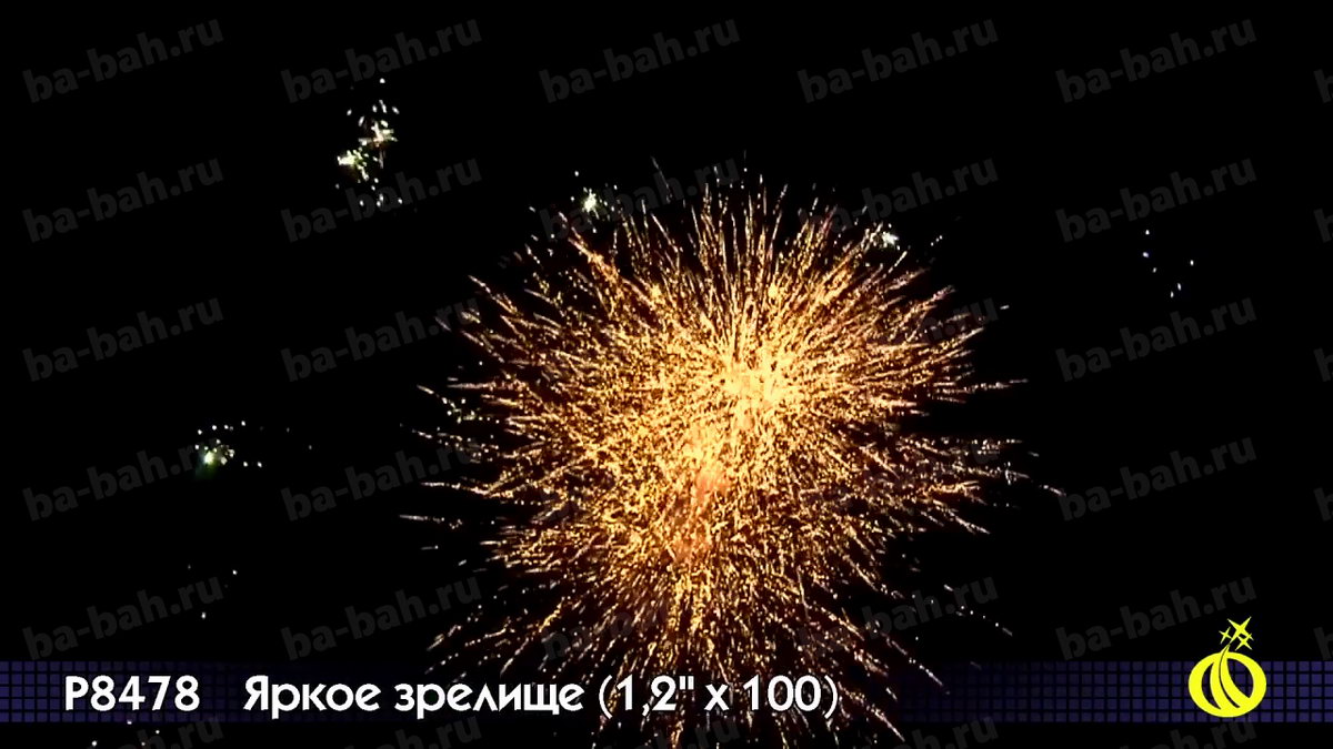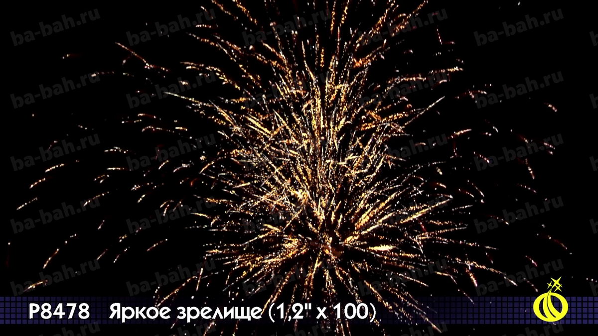Среди красот фейерверка "Яркое зрелище" - большие пионы из мелких красно-голубых звездочек; голубые искры, которые превращаются в диковинных серебрянных пчел или рыбок с искристыми шлейфами; крупные зеленые звезды с такими же шлейфами; букеты золотых хризантем, переходящих в мерцающие облака; алые кометы с длинными белыми хвостами; тончайшие золотые нити, переходящие в серебряный дождь. Финальный залп - целый лес золотых пальм с переходом в мерцающие и трещащие "блестки".