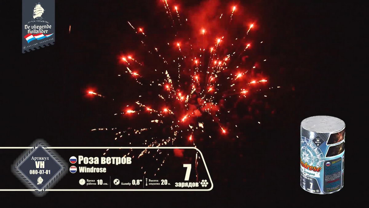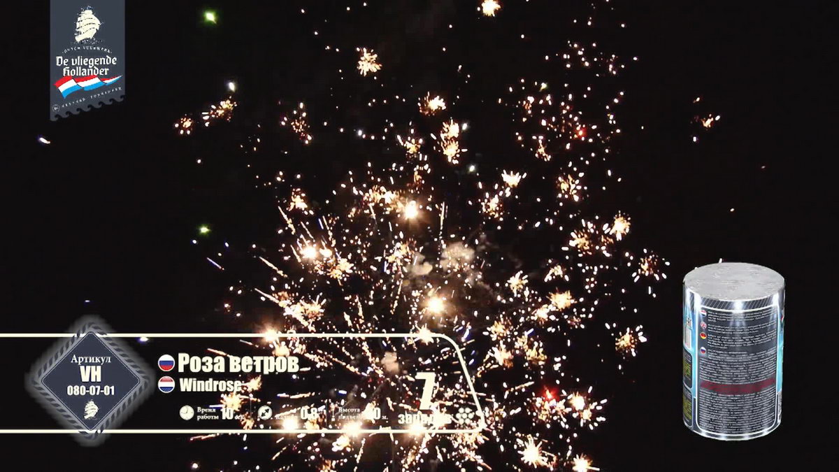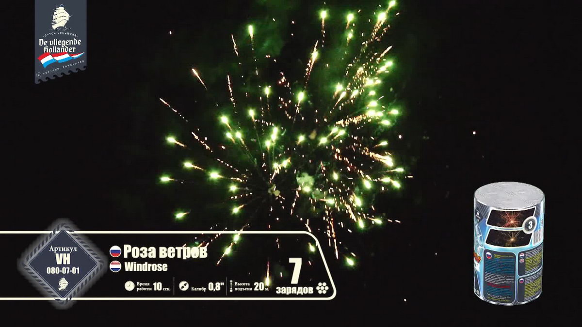 Фейерверк "Роза ветров" волнует, как хороший роман о морских приключениях. Это небольшой и недорогой салют на 7 выстрелов, в который попали только лучшие эффекты и цветовые сочетания. Зонтики салюта раскрываются на высоте 25 метров. Эффекты включают в себя красные, зеленые и серебристые жемчужины, каждый залп сопровождается облаком трещащих золотых вспышек. Порадуйте себя недорогим салютом, который воплощает европейскую изысканность и традиции!
