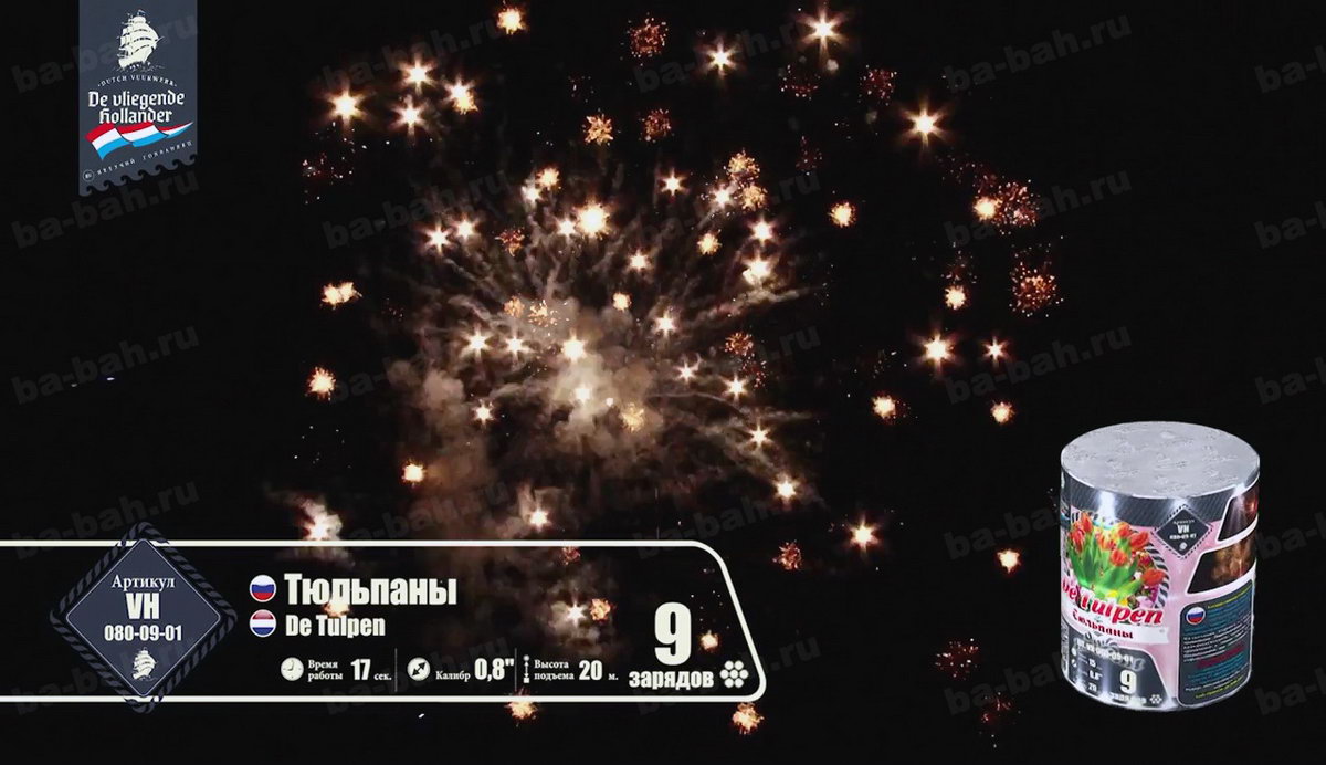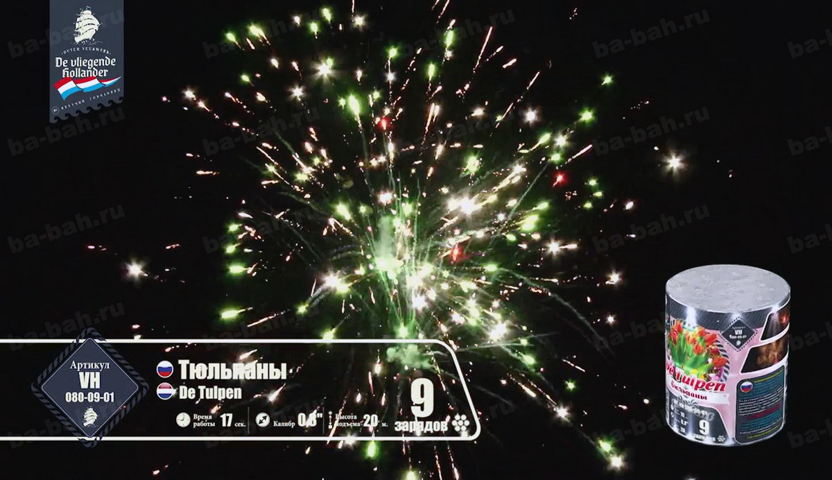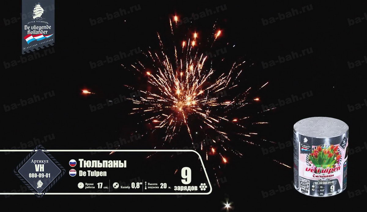 Приобретая салют "Тюльпаны", Вы покупаете билет в незабываемое виртуальное путешествие в Голландию. С первых же залпов Вас осыпает множеством ароматов лучших и самых дорогих сортов этих сказочных цветов. С замиранием сердца, Вы вновь и вновь почувствуете на себе легкий ветер Амстердама и приятное благоухание растущих повсюду тюльпанов. Капельки росы на нежных симметричных бутонах отражаются в салюте мерцающими крупными звездами на фоне расцветающих полей. Если Вас взволновал этот фейерверк, значит, не зря потрудились мастера. Вознаграждение ожидает зрителя салюта в финале, где все небо осыпается щедрыми золотистыми монетками - королевскими талерами трещащих мелких искр.