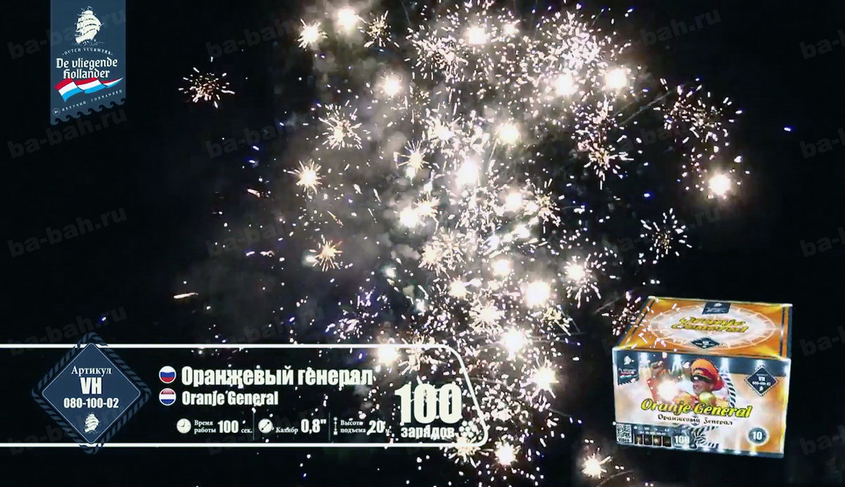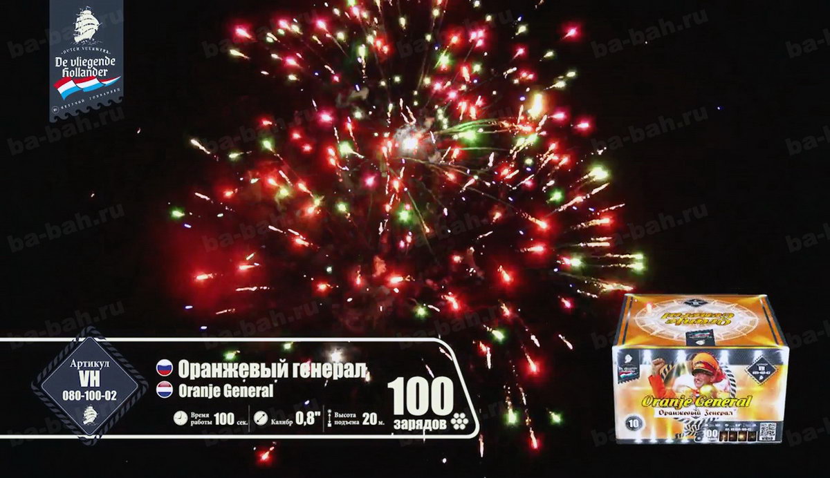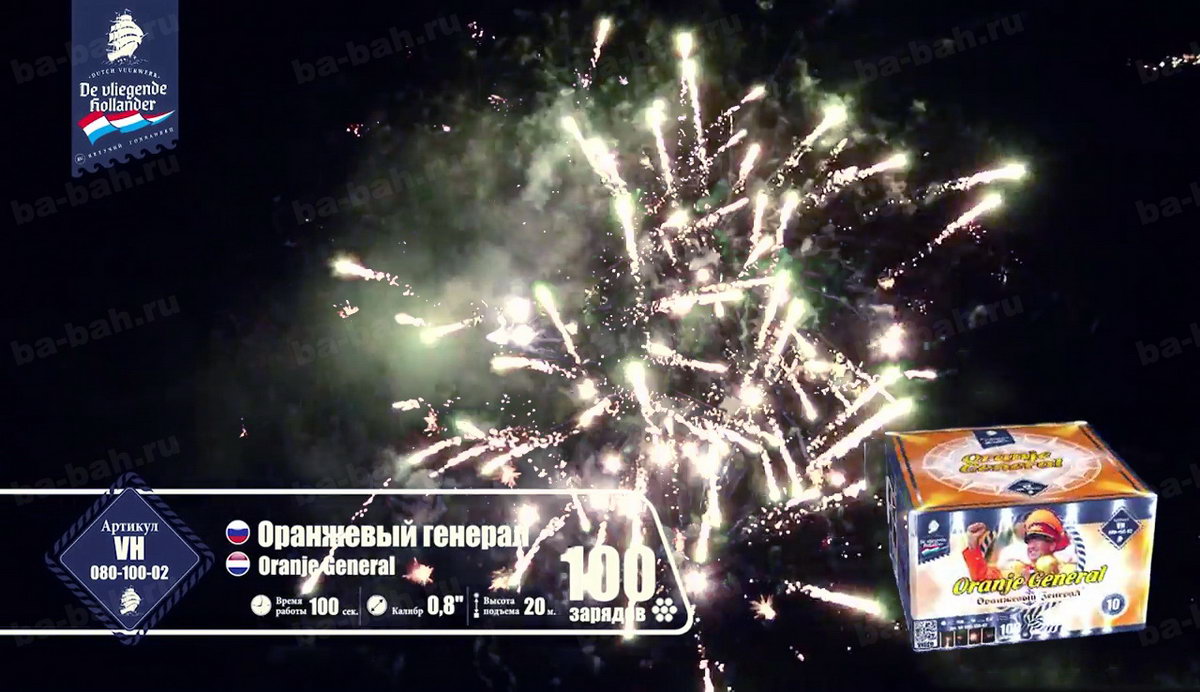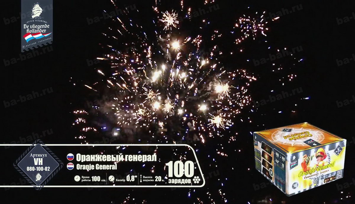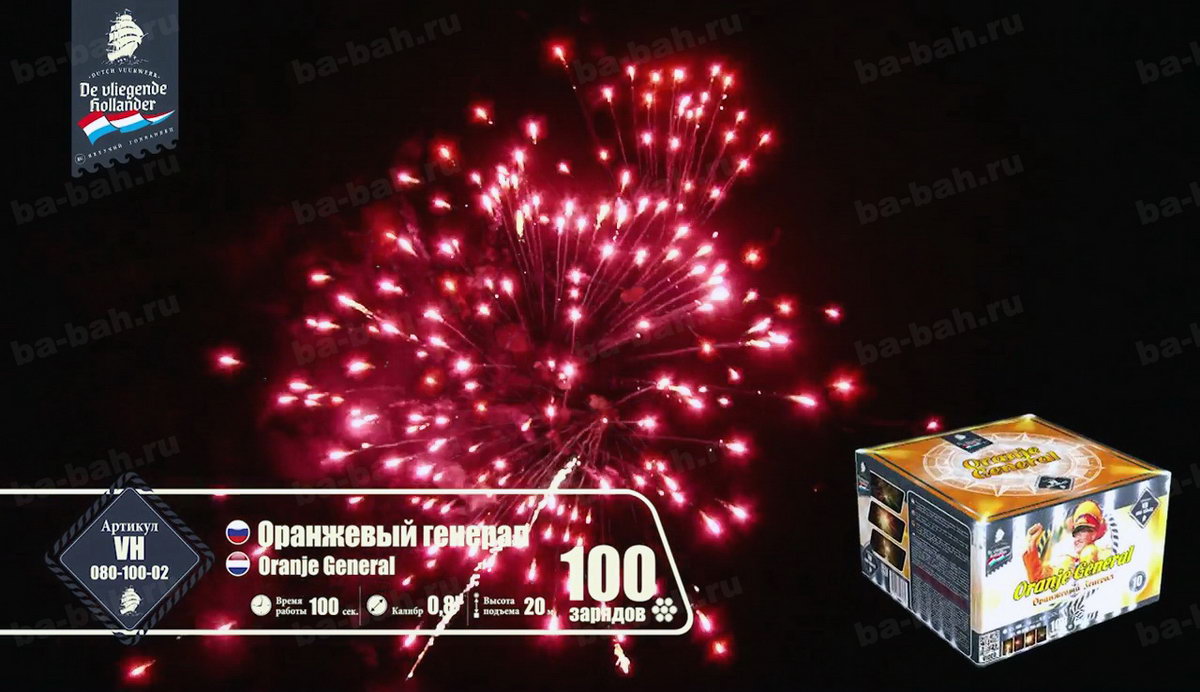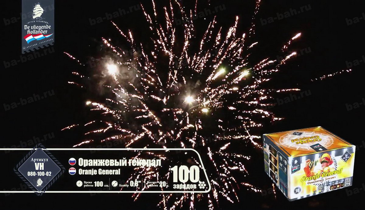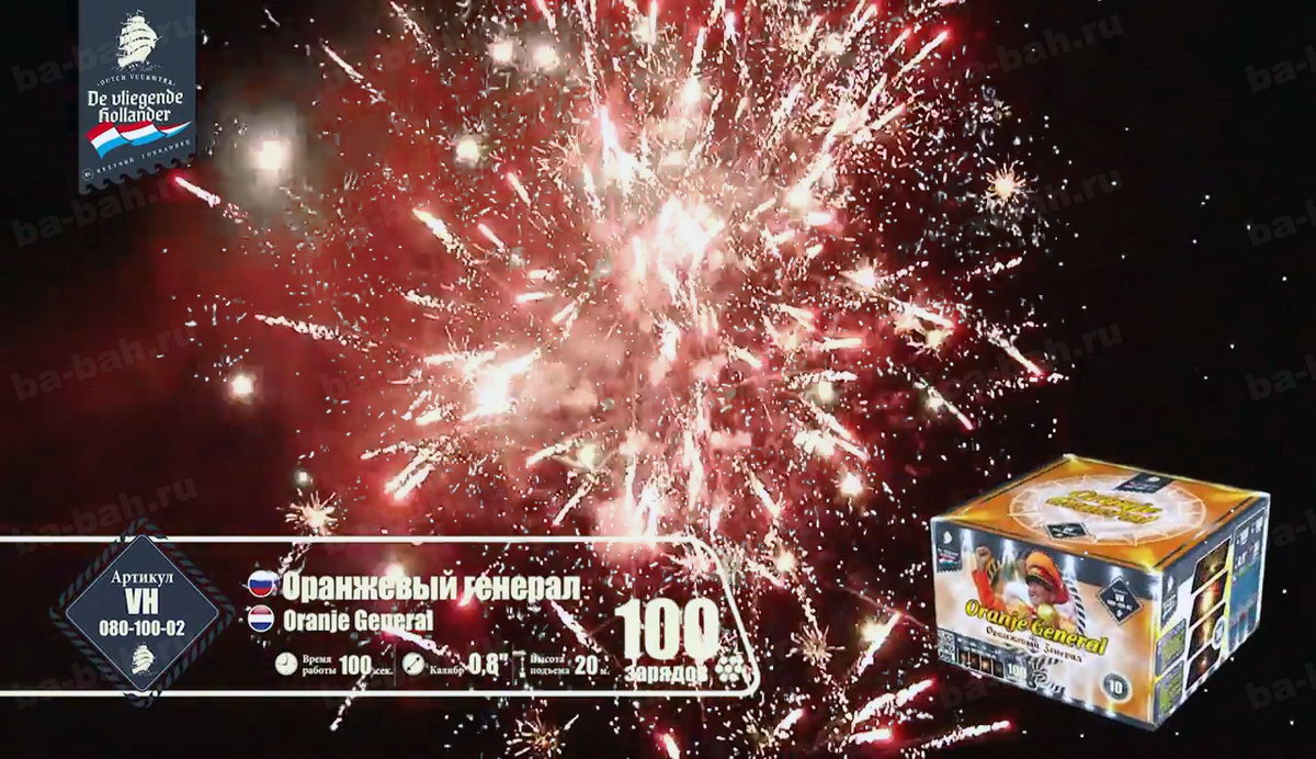 Калибр: 0.8 " Залпы: 100 Время работы: До 100 сек Высота фейерверка: До 20 м Цвет: Синий, Белый, Красный, Золотой, Желтый, Зеленый Праздник: Новый Год, День Рождения Размеры упаковки, мм: 260 х 260 х 170 Вес изделия, кг: 4.900 Фасовка: штука Число эффектов: 9 Описание: Оранжевый генерал - не просто название очередного зрелищного салюта. Это реальный человек, почетный болельщик сборной Голландии - Винфрид Витьес. Парадная генеральская форма и украшенная фуражка в тон костюму - померанцевого цвета. Привезенный из самой "страны тюльпанов" фейерверк - это хвала, уважение и низкий поклон всем фанатам и преданным болельщикам футбола. Спокойная игра на ночном небесном поле разноцветных огней против золотых разлетающихся звезд чередуется с особо опасными моментами и быстро забитым мячом - свистящей змейкой! Она летит настолько быстро и четко, что, кажется, футбольный мяч несется прямо в ворота и попадает точно в цель! Грандиозный финал - рев трибун, шум победы и радость болельщиков и команды, выраженная одновременными выстрелами множества разноцветных комет с яркими шлейфами, искрами и разрывающимися звёздами! Так приятно ощущать себя частью большого футбола и чувствовать себя чемпионом! Эффекты: 1. Сферы крупных красных звезд. 2. Белые мерцающие звезды. 3. Красно-зеленые искры, золотистая парча. 4. Трещащие вспышки. 5. Красно-зеленые пионы с синими искрами. 6. Лимонные звезды с парчовыми хвостами. 7. Свистящие кометы. 8. Мерцающие звезды, синие искры. 9. Эффектные завершающие залпы. Комментарии к товару