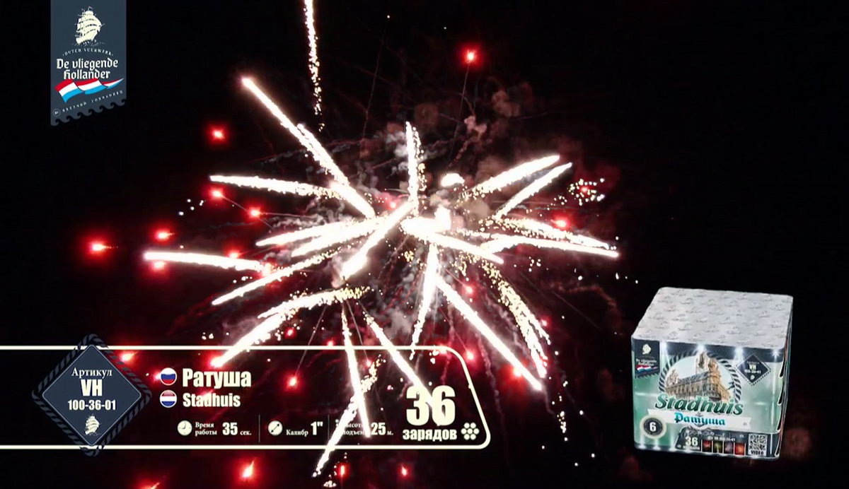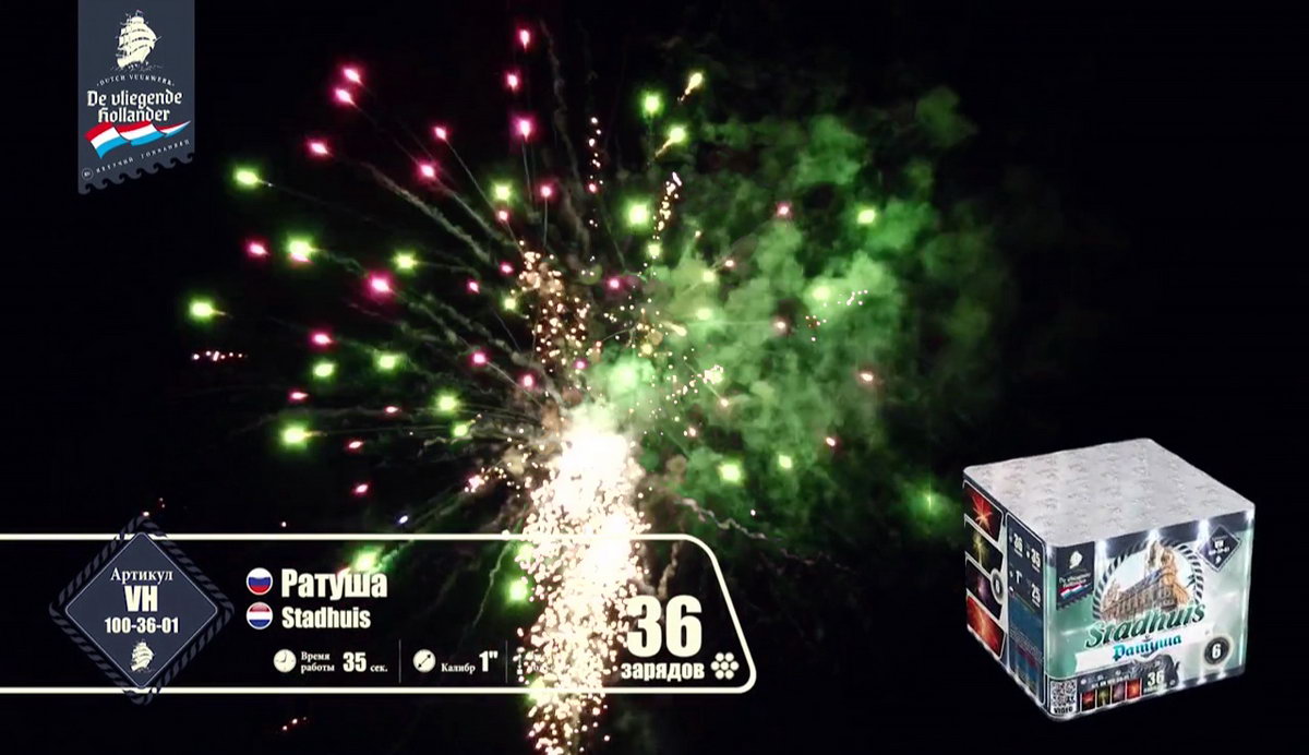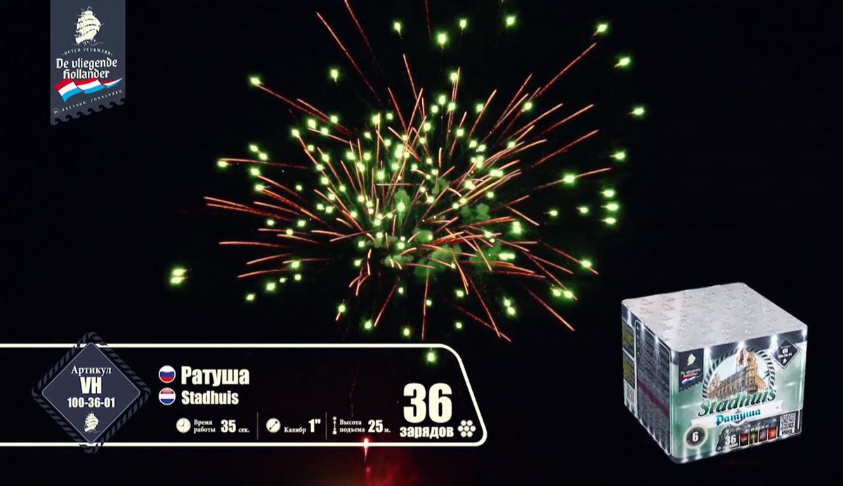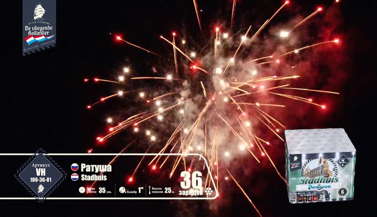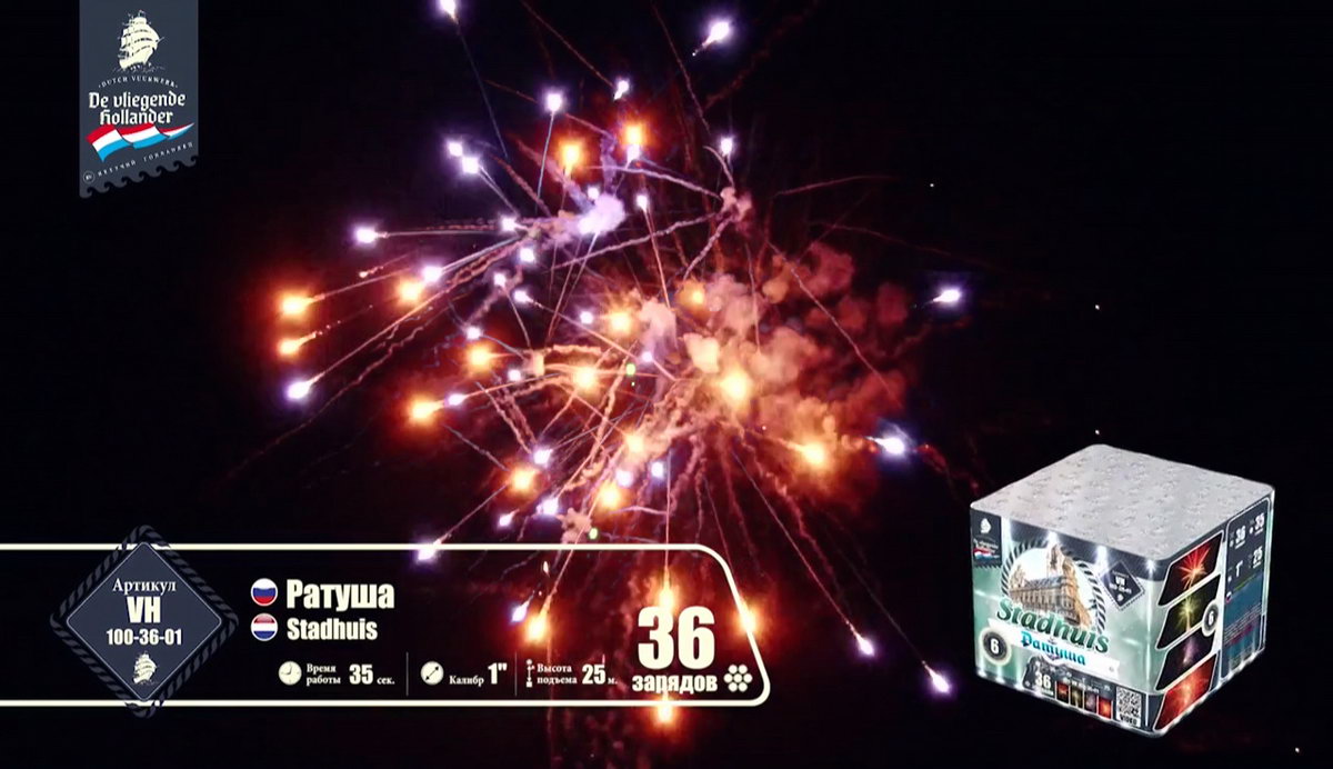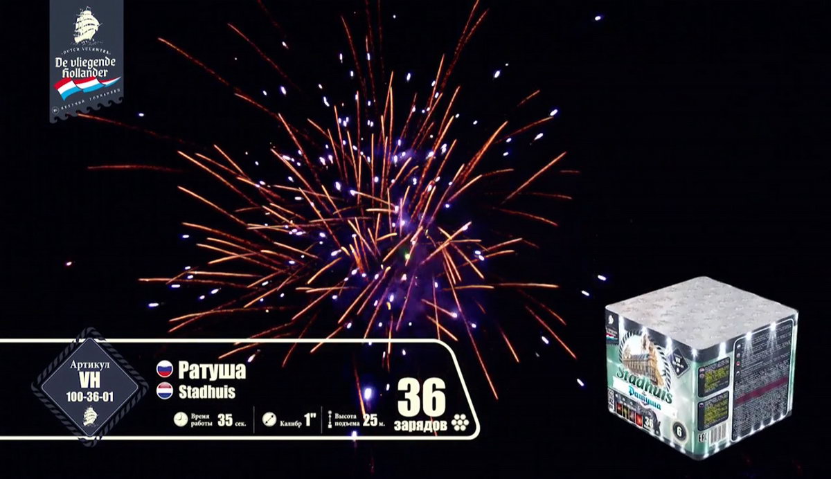 Калибр: 1 " Залпы: 36 Время работы: До 35 сек Высота фейерверка: До 25 м Цвет: Золотой, Фиолетовый, Белый, Красный, Серебряный, Оранжевый, Зеленый Праздник: Новый Год, День Рождения Размеры упаковки, мм: 190 х 180 х 150 Вес изделия, кг: 2.800 Фасовка: штука Число эффектов: 6 Описание: Уподобимся любознательным туристам и отправимся поглазеть на средневековую Делфтскую Ратушу, которая находится на родине салюта, в Голландии. Окунемся в мир прекрасной и гармоничной ренессансной архитектуры. Не зря именно этой городской постройке уделили внимание пиротехнические мастера. У себя на родине она считается эталоном красоты. Жители Делфта ласково называют ее "камень". Все это учтено в пиротехническом произведении искусства: симметричные огненные языки и малахитово-зеленые огни - это фундамент здания Эффекты: 1. Оранжевые пальмы, зеленые звезды. 2. Сферы из крупных сиреневых и оранжевых звезд. 3. Белые кокосовые пальмы с красными искрами. 4. Серебряные вертушки-швермеры разрываются фиолетовыми и зелеными огнями. 5. Оранжевые пальмы, фиолетовые звезды. 6. Множество золотистых пальм с вспыхивающими красными и белыми огоньками, с переходом в бело-лунное мерцание (залп). Комментарии к товару