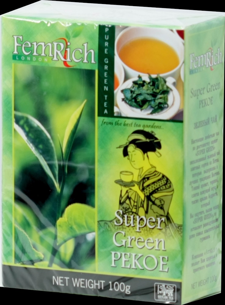 Наличие: >100 ЧАЙ FemRich ЗЕЛЕНЫЙ SUPER GREEN PEKOEНастоящие любители чая по достоинству оценят эксклюзивный зеленый чай элитных сортов из Китая, которые выдержаны в лучших традициях Востока. Тонкий аромат, терпкий, слегка вяжущий вкус, а таже прилив бодрости, который Вы ощутите, выпив чашку "SUPER GREEN", не оставляет равнодушными даже самых взыскательных гурманов. Комментарии к товару