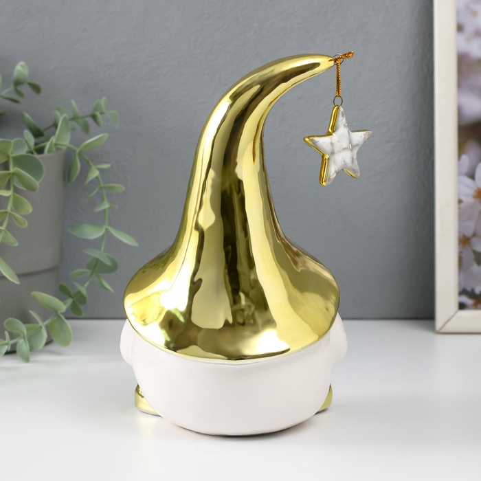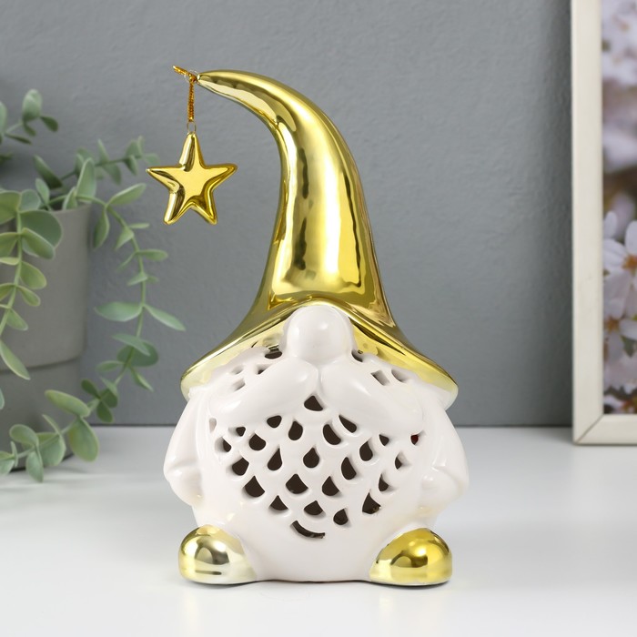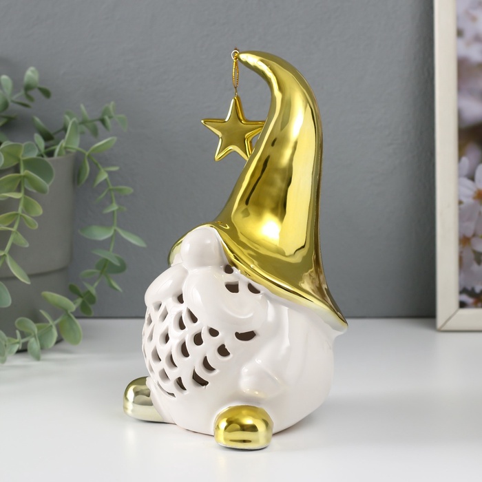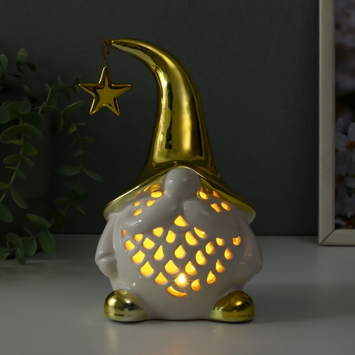 Этот светящийся гном станет волшебным дополнением новогоднего интерьера. Керамическая фигурка в стиле «новогоднее барокко» с золотым колпаком создаёт в комнате мягкое жёлтое свечение, наполняя пространство теплом и ожиданием праздника.