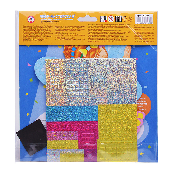 • Набор для творчества, в котором украшать блестящими ЭВА-деталями мозаики нужно яркую, вырубленную по контуру, картонную фигурку. • В наборе: - цветная основа с рисунком и схемой размещения деталей, вырубленная по форме предмета (19х14 см.) - детали из ЭВА с голографическим покрытием на самоклеящейся основе. - магнитный винил. - цветная листовка-образец. • Материал: картон. • Соответствует требованиям безопасности продукции. • Для детей от 5 лет.