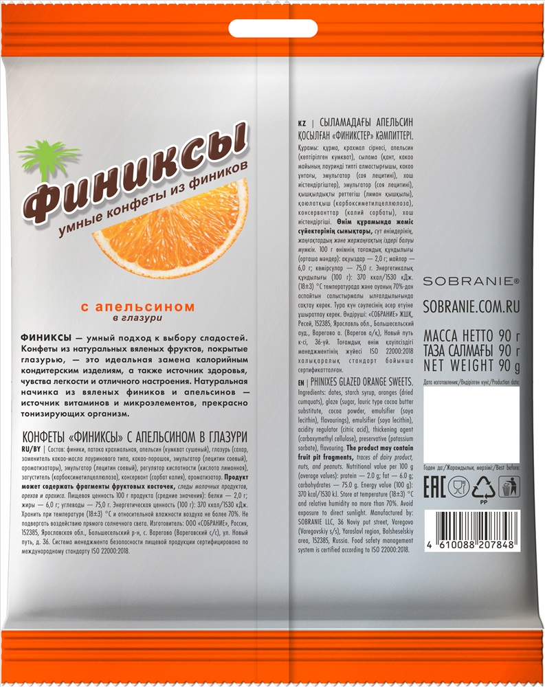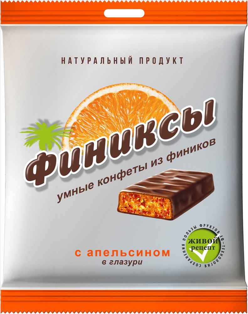 Конфеты на основе сухофруктов в глазури.ФИНИКСЫ — умный подход к выбору сладостей. Конфеты из натуральных сухофруктов, покрытые глазурью — это идеальная замена калорийным кондитерским изделиям, а также источник здоровья, чувства легкости и отличного настроения. Начинка из мякоти натуральных вяленых фиников и апельсинов — источник витаминов и микроэлементов, прекрасно тонизирующих организм.
