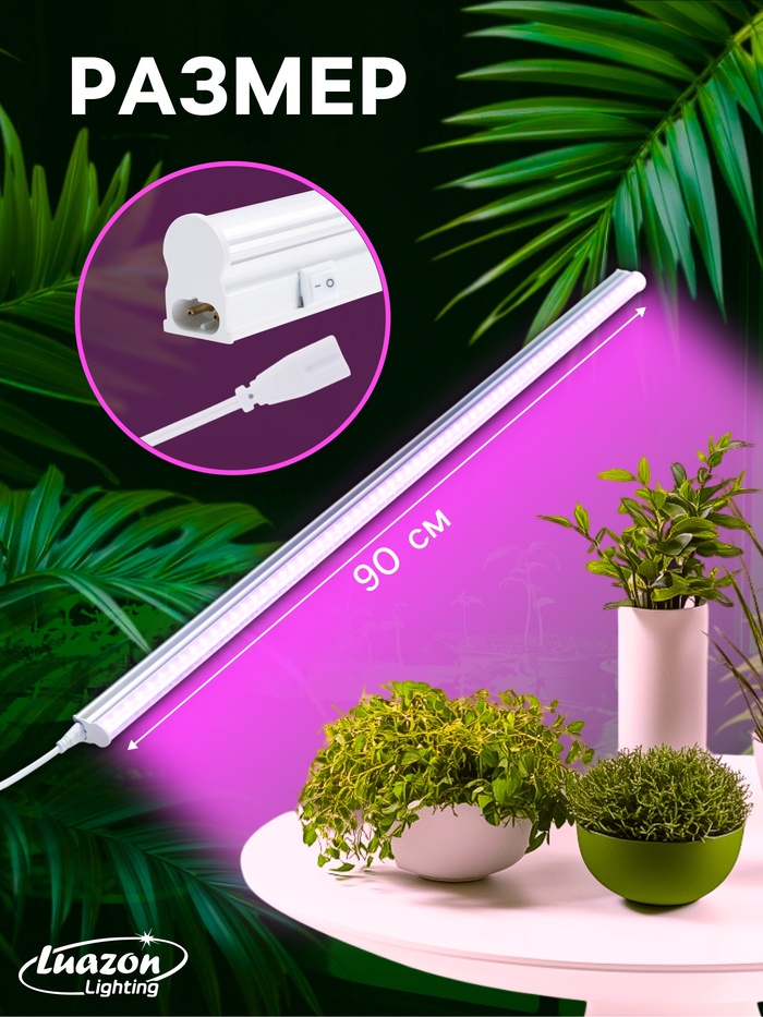 Габариты: 106,5 x 3,8 x 2,5 Страна: Китай В боксе: 50 шт Состав: Металл, пластик Материалы: металл, пластик Фасовка: по 1 шт Индивидуальная упаковка: Цветная коробка Габариты товара: 87,7 см × 2,1 см × 1,9 см Сертификат: ЕАС Цвет свечения: Розовый Цвет: Белый Длина, мм: 900 Мощность, Вт: 14 Гарантийный срок, мес.: 12 Фотосинтетический поток фотонов, мкмоль/с: 15 Угол рассеивания, °: 120 Напряжение, В: 220 Материал корпуса: Пластик Поддерживает USB: Нет Степень защиты: IP20 Таймер: Нет Пульт управления: Нет Регулировка яркости: Нет Подставка в комплекте: Нет Цвет корпуса: Белый Вид рассеивателя: Прозрачный Держатель в комплекте: Да Спектр свечения: Мультиспектральный Тип питания: От сети 220 В Регулировка положения: Нет Создайте идеальные условия для роста ваших растений с помощью современного светодиодного фитосветильника. Этот компактный и энергоэффективный прибор станет вашим надёжным помощником в уходе за зелёными питомцами, обеспечивая их необходимым светом даже в условиях недостатка естественного освещения. Его продуманный дизайн и передовые технологии делают его идеальным выбором для любителей растений и профессиональных садоводов. Светильник мощностью 14 Вт и длиной 900 мм излучает мультиспектральный свет с преобладанием розового оттенка, который оптимально подходит для стимулирования фотосинтеза и активного роста растений. Прозрачный рассеиватель обеспечивает равномерное распределение света, создавая комфортные условия для зелени без резких бликов. Угол рассеивания 120° позволяет охватить большую площадь, что делает устройство универсальным для использования в домашних оранжереях, на подоконниках или в небольших теплицах.