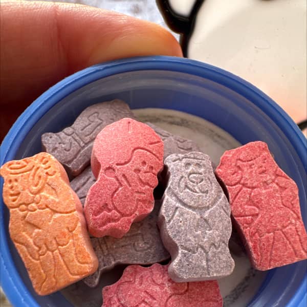 ‡ Среди жевательных витаминов для детей. Рекомендации по применениюПод наблюдением взрослых продукт необходимо полностью разжевать или измельчить. Дети от 2 до 3 лет: полностью разжевывать по половине таблетки в день во время еды. Взрослые и дети от 4 лет и старше: полностью разжевывать по одной таблетке в день во время еды. ИнгредиентыГранулированный карбонат кальция (карбонат кальция, моногидрат декстрозы†, сахар†, мальтодекстрин, микрокристаллическая целлюлоза), сорбитол, аскорбат натрия, фумарат железа, натуральные и искусственные ароматизаторы, предварительно желатинизированный крахмал, dl-альфа токоферилацетат; менее 2% бета-каротина, биотин, пантотенат кальция, холекальциферол, оксид меди, цианокобаламин, краситель синий 2 FD&C алюминиевый лак, краситель красный 40 FD&C алюминиевый лак, краситель желтый 6 FD&C алюминиевый лак, фолиевая кислота, желатин, оксид магния, стеарат магния, моно- и диглицериды, никотинамид, йодид калия, пиридоксина гидрохлорид, фитонадион, рибофлавин, диоксид кремния, соевый лецитин, сукралоза, мононитрат тиамина, ацетат витамина A, оксид цинка. Содержит сою. *Содержит незначительное количество добавленного сахара. ПредупрежденияНе использовать, если защитная пленка с маркировкой Bayer HealthCare под крышкой повреждена или отсутствует. Продукт не предназначен для детей младше 2 лет. Хранить в недоступном для детей месте. Перед применением во время беременности или кормления грудью, приема медицинских препаратов, а также при наличии каких-либо заболеваний следует проконсультироваться с врачом. Случайная передозировка продуктами, содержащими железо, — основная причина отравлений со смертельным исходом среди детей до 6 лет. Хранить в недоступном для детей месте. При случайной передозировке следует немедленно обратиться к врачу или в токсикологический центр. Хранить при комнатной температуре. Следует избегать воздействия высоких температур — более 40 °C (104 °F).