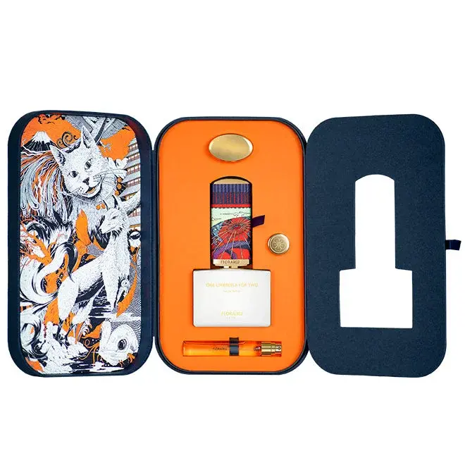Парфюм One Umbrella For Two заключен в белоснежный флакон с высоким колпачком, обтянутым черной итальянской гранулированной кожей с изображением традиционных японских зонтиков. Чехол колпачка сшит вручную и может использоваться в качестве футляра для миниатюры-рефила объемом 10 мл.