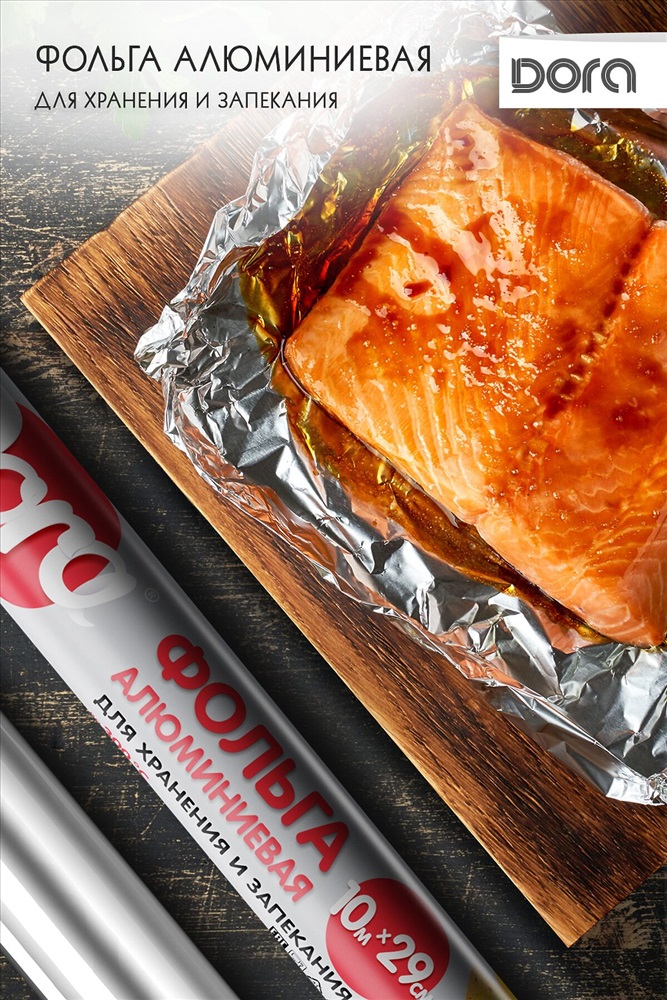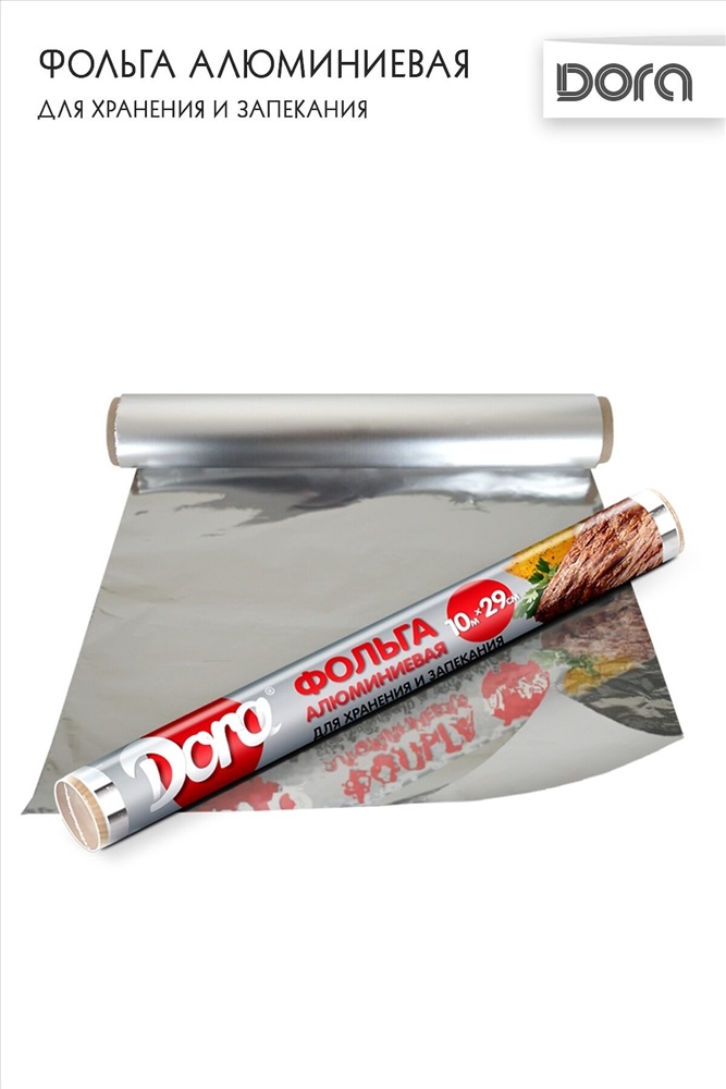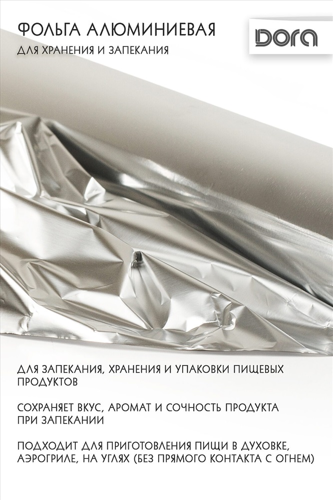 Фольга алюминиевая DORA предназначена для хранения, запекания и упаковки пищевых продуктов. Фольга алюминиевая DORA позволяет готовить блюда в собственном соку, который придает блюдам сочность. Продукты сохраняют натуральный вкус, витамины и микроэлементы. Не впитывает запахи и жир, не пропускает воду. Благодаря плотности 9 микрон фольга обладает повышенной прочностью на разрыв. Фольга алюминиевая DORA подходит для приготовления пищи в духовом шкафу, аэрогриле, на углях (без прямого контакта с огнем) при температуре не выше 600 С.Экологически безопасна. Фольга алюминиевая DORA значительно облегчает процесс приготовления блюд в духовке, помогает сохранять в продуктах полезные вещества, а также экономит ваше время и силы.