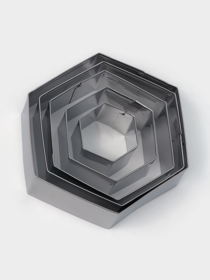 Набор из 5 форм для выпечки печенья в виде элегантных шестиугольников. Изготовлены из прочной нержавеющей стали. Размеры: 9.6x8.3x2.5 см. Позволяют создавать оригинальное и красивое печенье для любого случая.