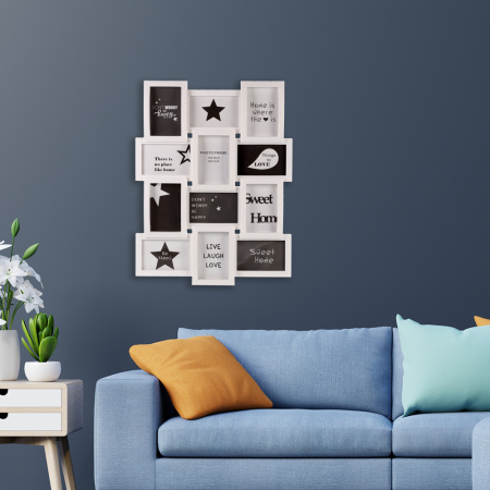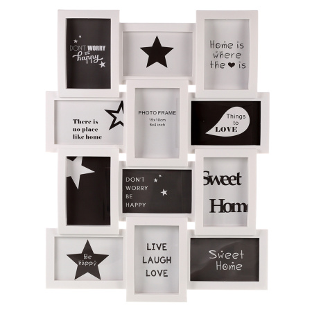 Фоторамка - коллаж на двенадцать фотографий, с размерами: 6 штук-10х15 см, 6 штук-15х10 см. Фоторамка станет удачным подарком или украшением вашего интерьера.