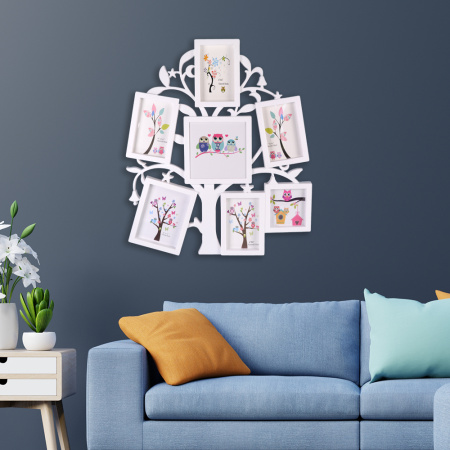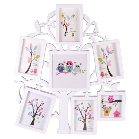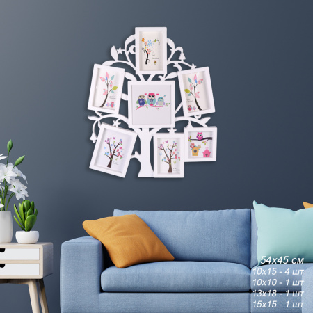 Фоторамка - коллаж на семь фотографий, с размерами: 1 штука-15х15 см, 4 штуки-10х15 см, 1 штука-10х10 см, 1 штука-13х18 см. Фоторамка станет удачным подарком или украшением вашего интерьера.