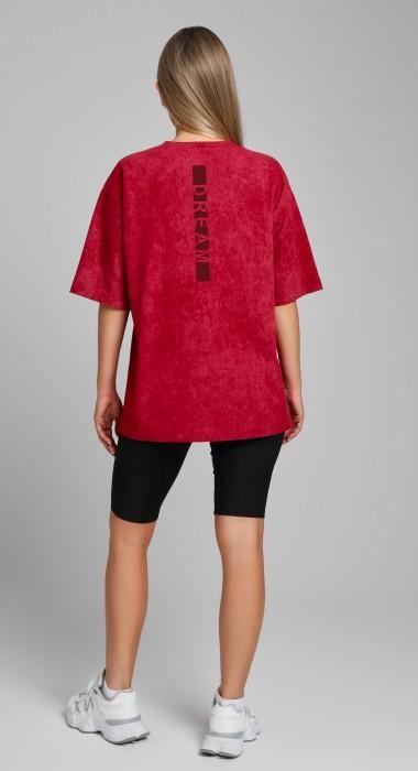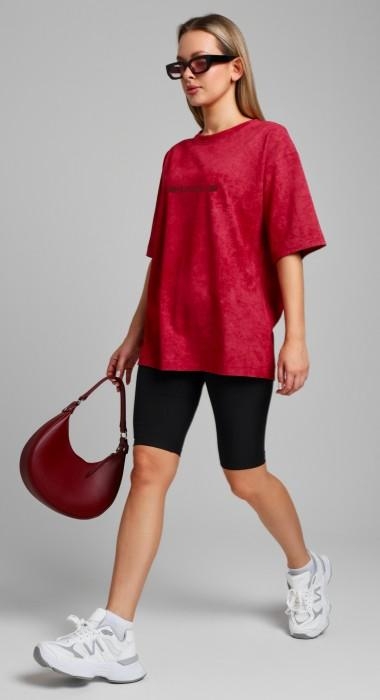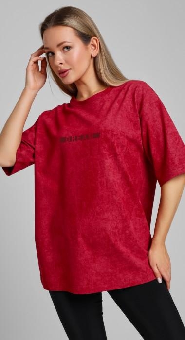 Футболка женская из трикотажного полотна "кулирка-варенка", с удлиненными плечевыми швами, втачными короткими рукавами, горловиной овальной формы, обработанной втачной планкой, и принтом на детали переда, выполненным в технике шелкографии. По горловине изделия настрочена отделочная строчка.