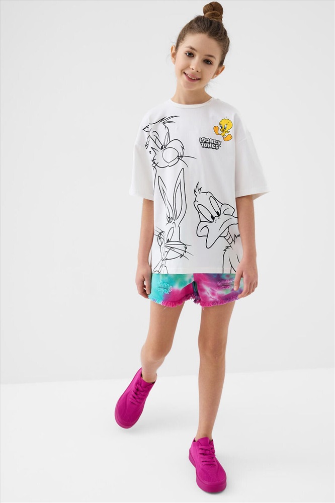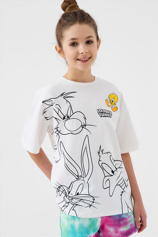 Футболка оверсайз для девочки подростка. Модель выполнена из эластичного хлопкового трикотажа джерси. На груди расположен крупный принт с любимыми персонажами "Looney Tunes".