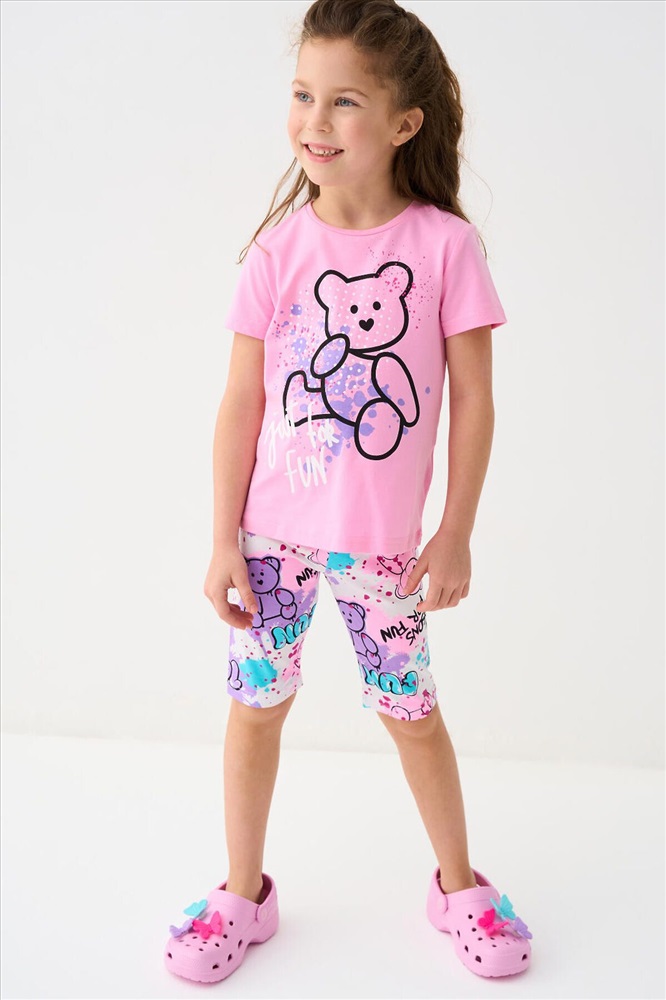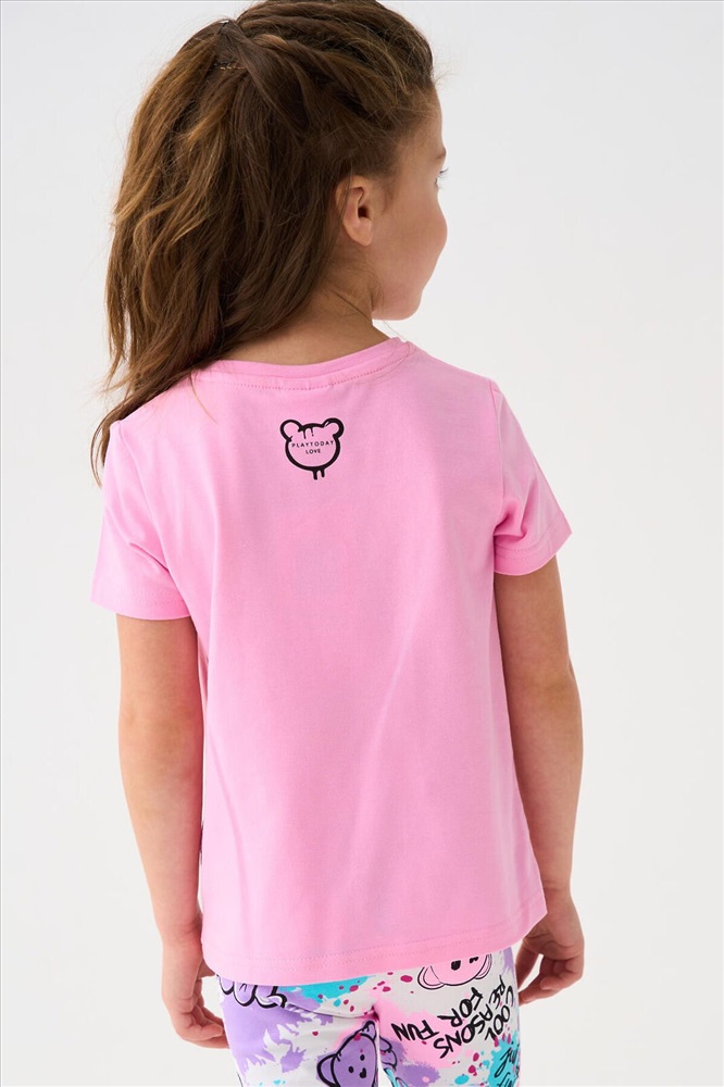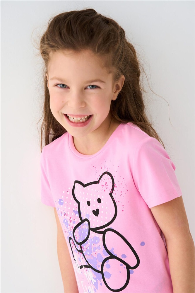 Детская футболка для девочки. Модель прямого кроя, выполнена из эластичного хлопкового трикотажа джерси. Красочный принт с милым мишкой. Горловина круглая.