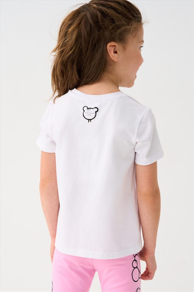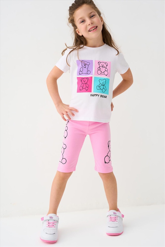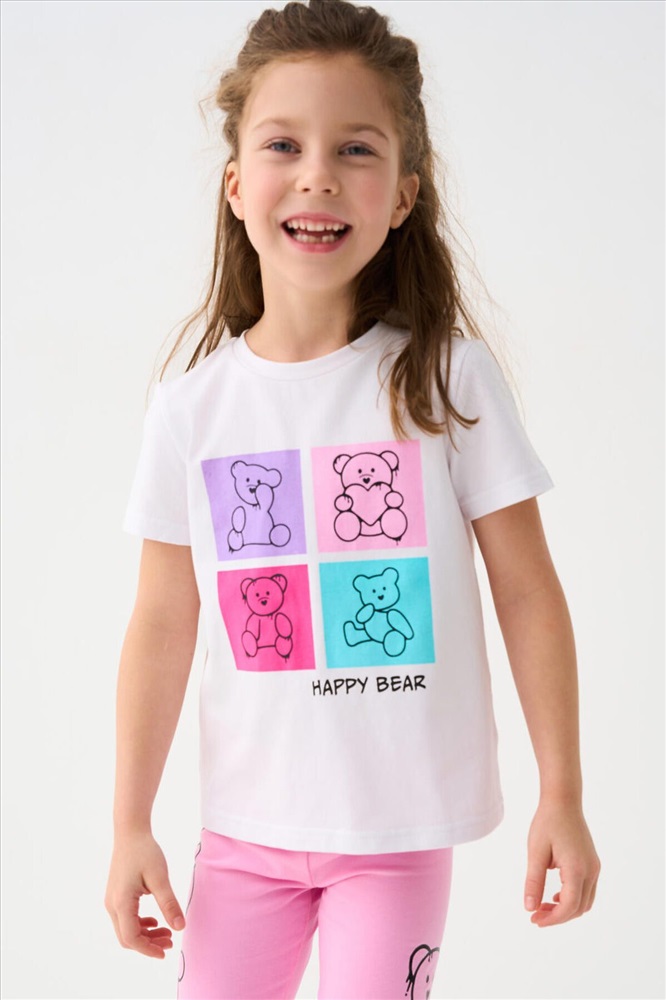 ID товара: 1240011 Состав: 95% хлопок, 5% эластан Сезон: Весна/Лето Детская футболка для девочки. Модель прямого кроя, выполнена из эластичного хлопкового трикотажа джерси. Красочный принт с милыми мишками. Горловина круглая. Комментарии к товару