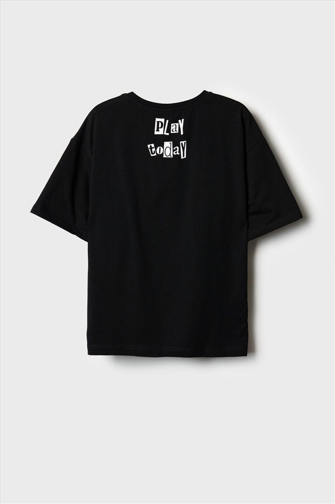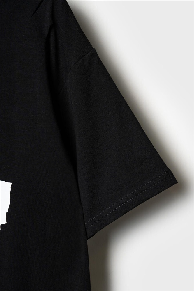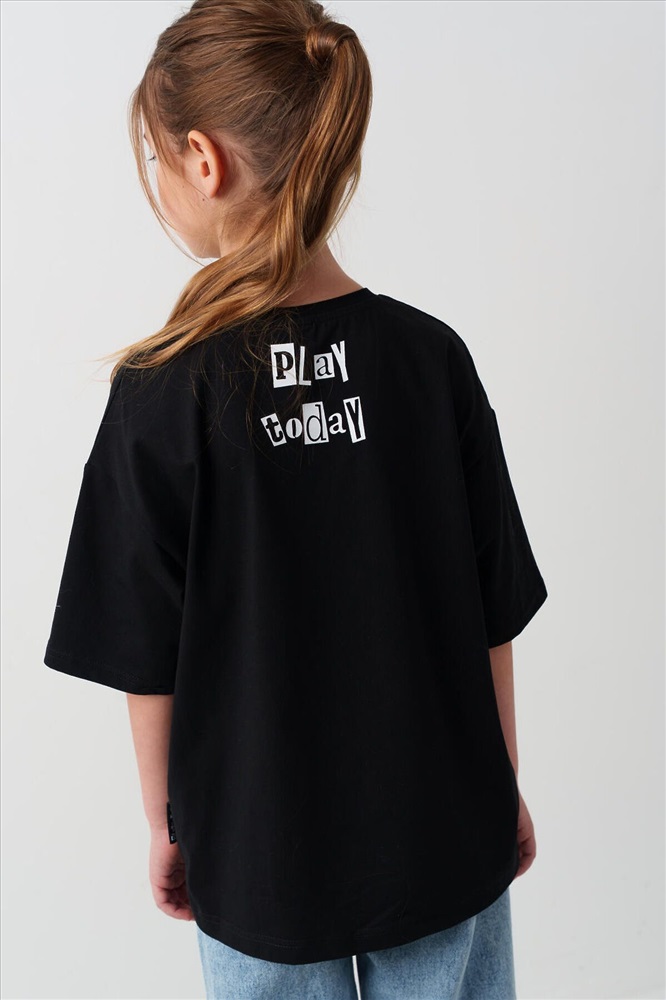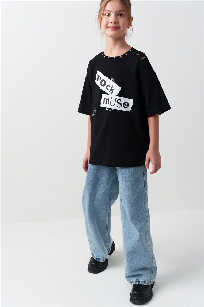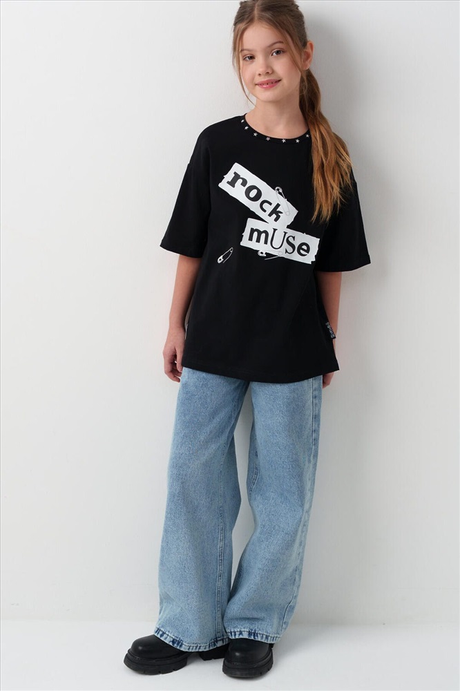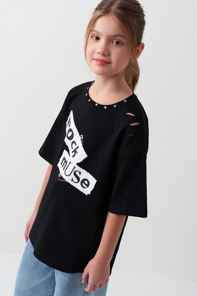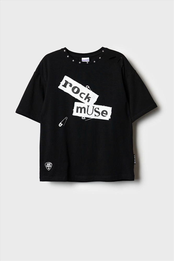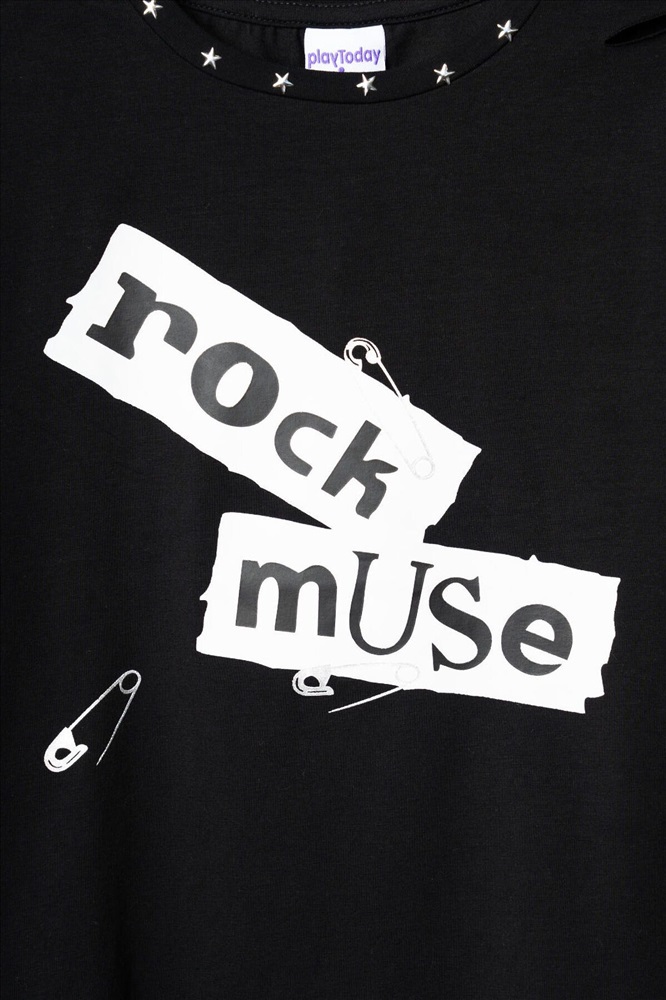 Футболка оверсайз для девочки подростка. Модель выполнена из эластичного хлопкового трикотажа джерси. Принты в рок-стилистике. На передней части расположена надпись "rock muse" с графикой, имитирующей булавки. На спинке — логотип. Горловина украшена принтом с белыми звёздами. Дополнительные элементы дизайна — декоративные разрывы на плече, металлическая нашивка внизу и боковая лента с логотипом бренда.