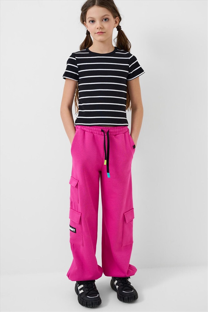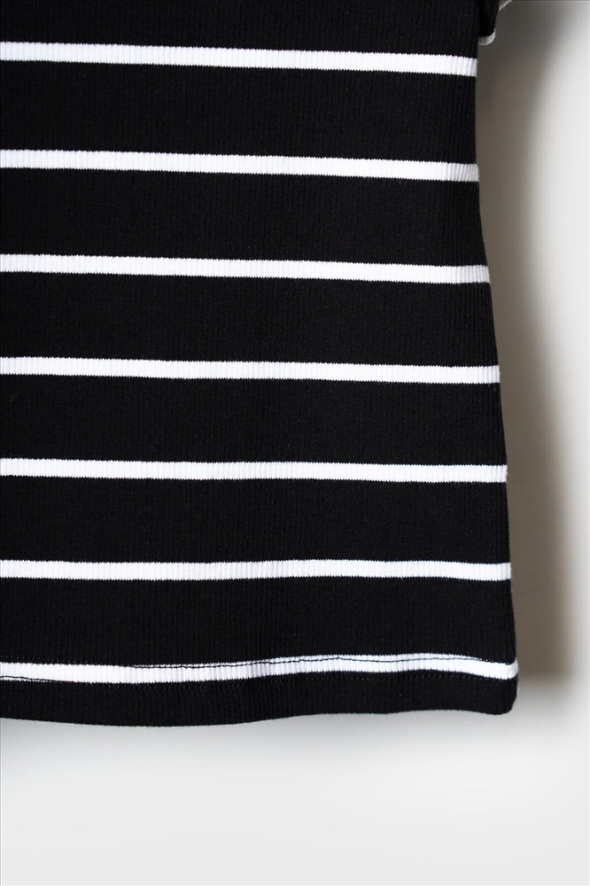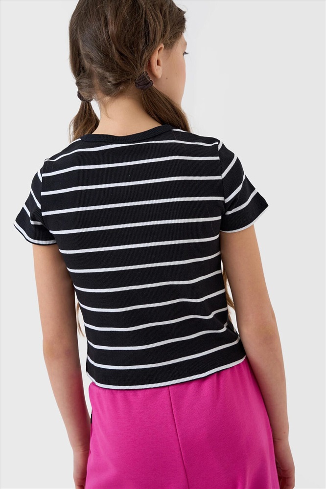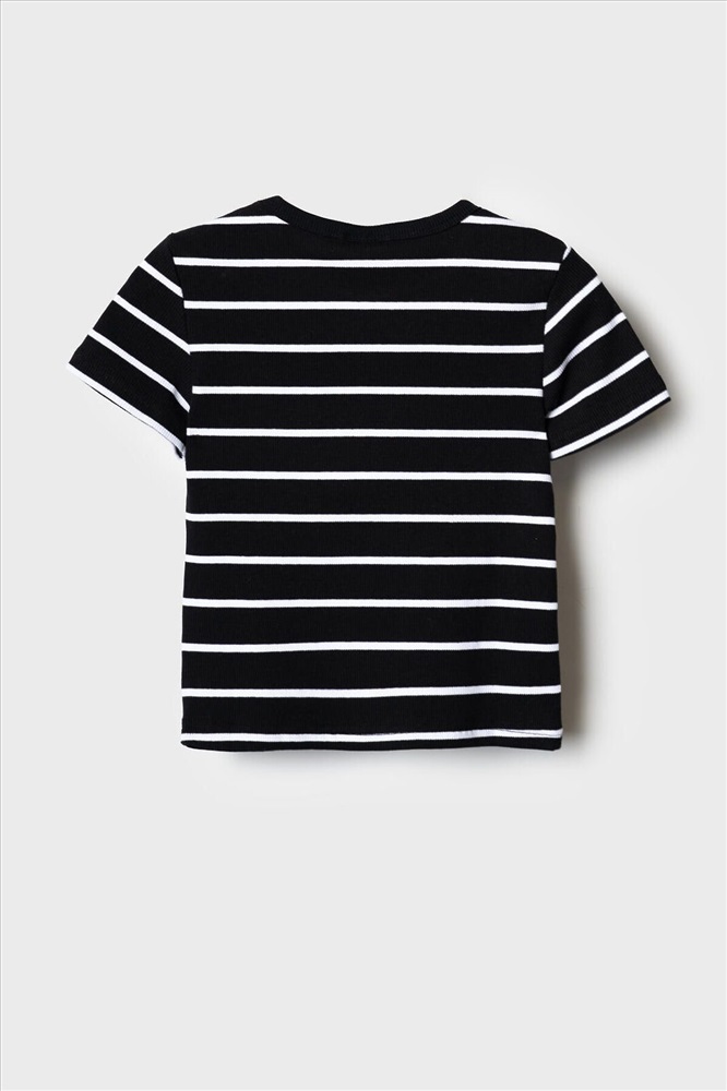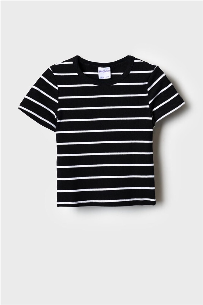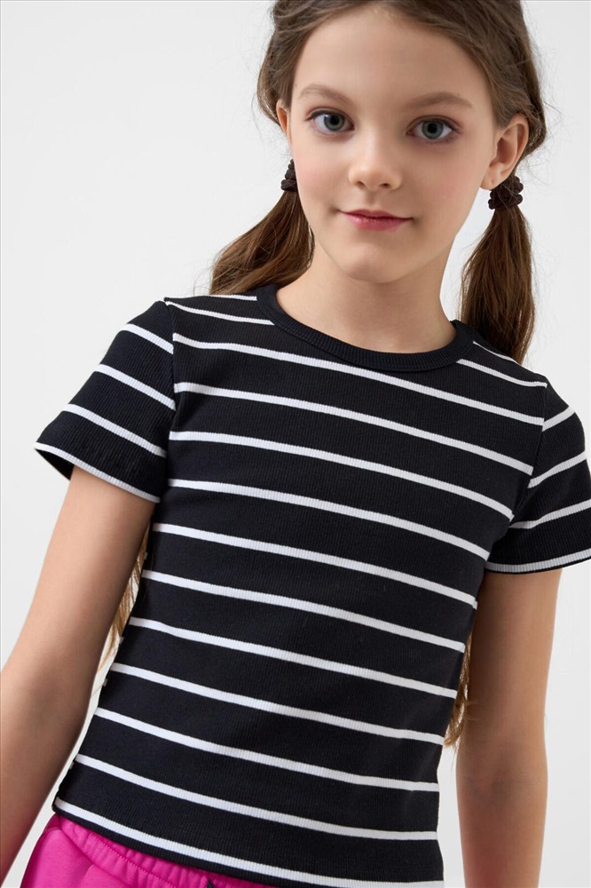 Сезон: Весна/Лето Футболка в полоску для девочки подростка. Модель укороченная, выполнена из эластичного хлопкового трикотажа в рубчик. Горловина круглая.