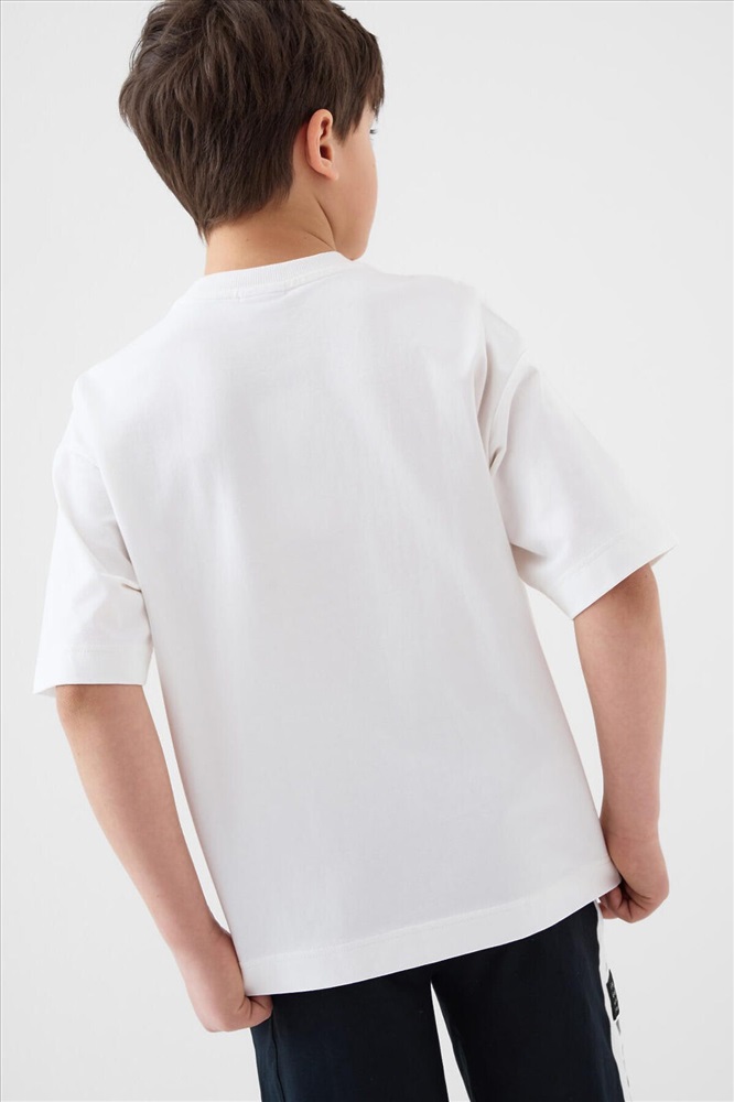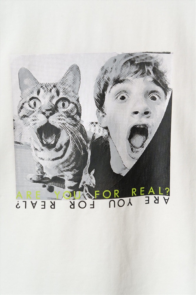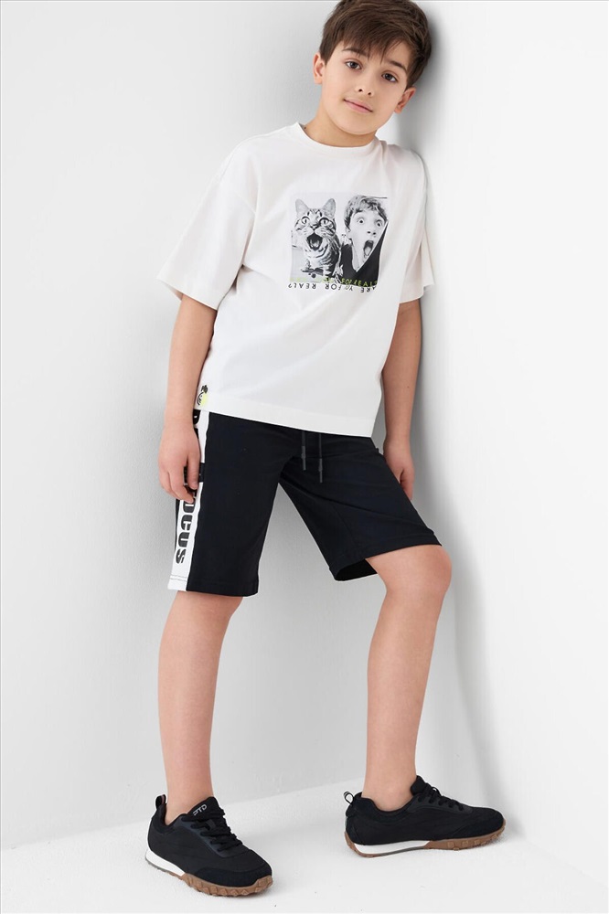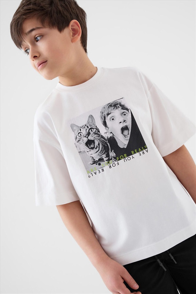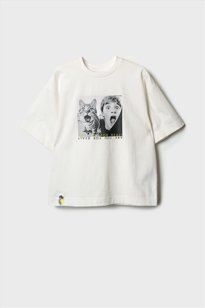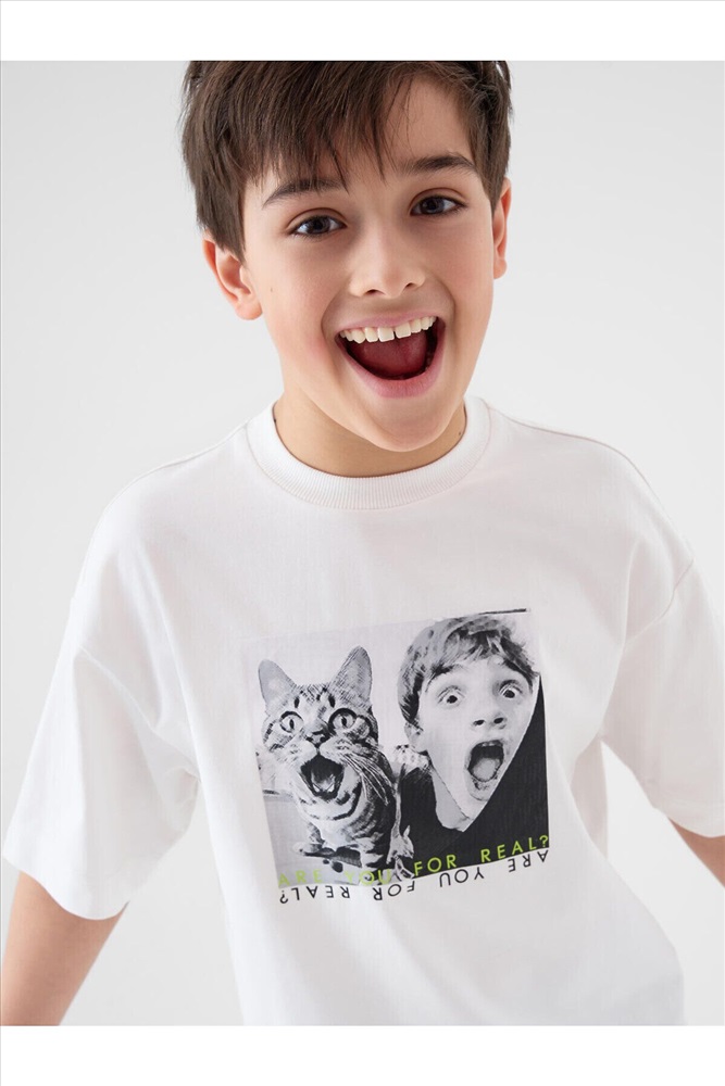 ID товара: 1242476 Состав: 95% хлопок, 5% эластан Сезон: Весна/Лето Футболка оверсайз для мальчика подростка. Модель выполнена из эластичного хлопкового трикотажа джерси. На груди расположен крупный принт с изображением мальчика и кота. Горловина круглая, обработана эластичным рибом. В нижней части — небольшая силиконовая нашивка. Комментарии к товару