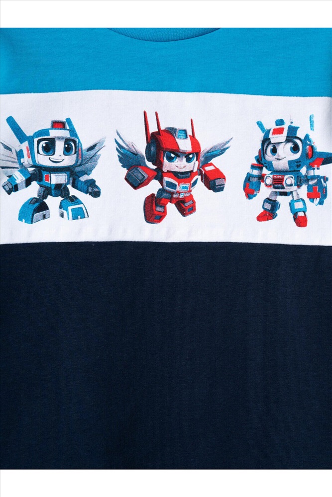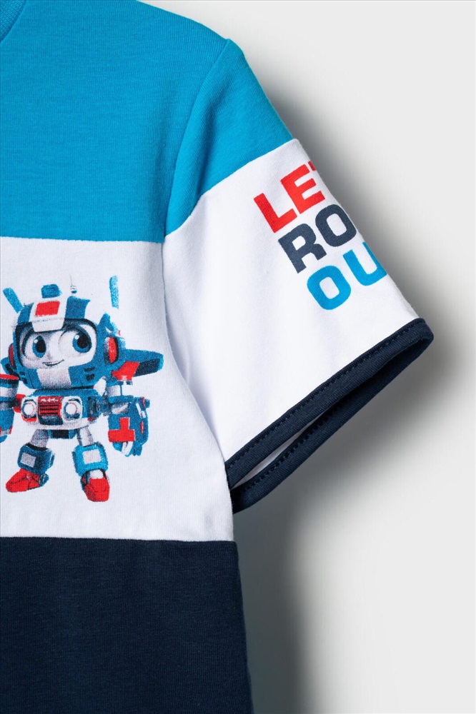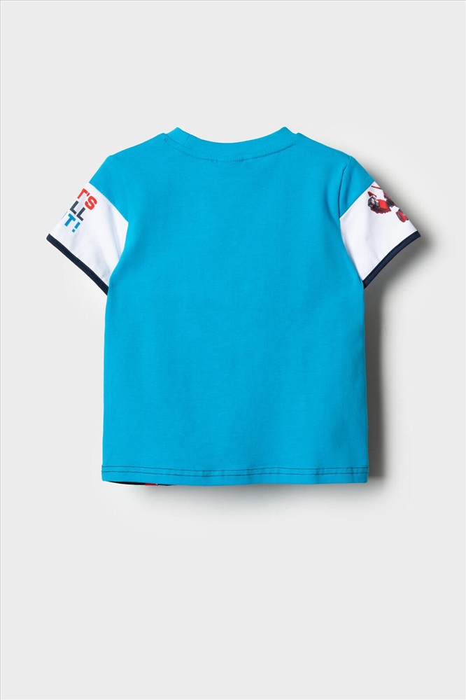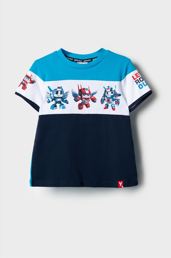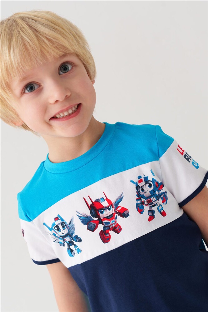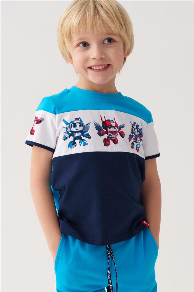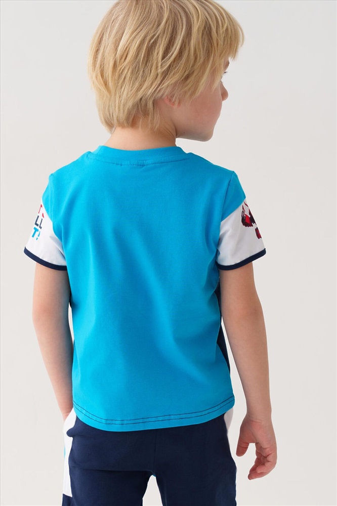 Детская футболка для мальчика. Модель прямого кроя, выполнена из эластичного хлопкового трикотажа джерси. Спереди расположен принт. Горловина круглая, обработана эластичным рибом. В нижней части — небольшая нашивка.