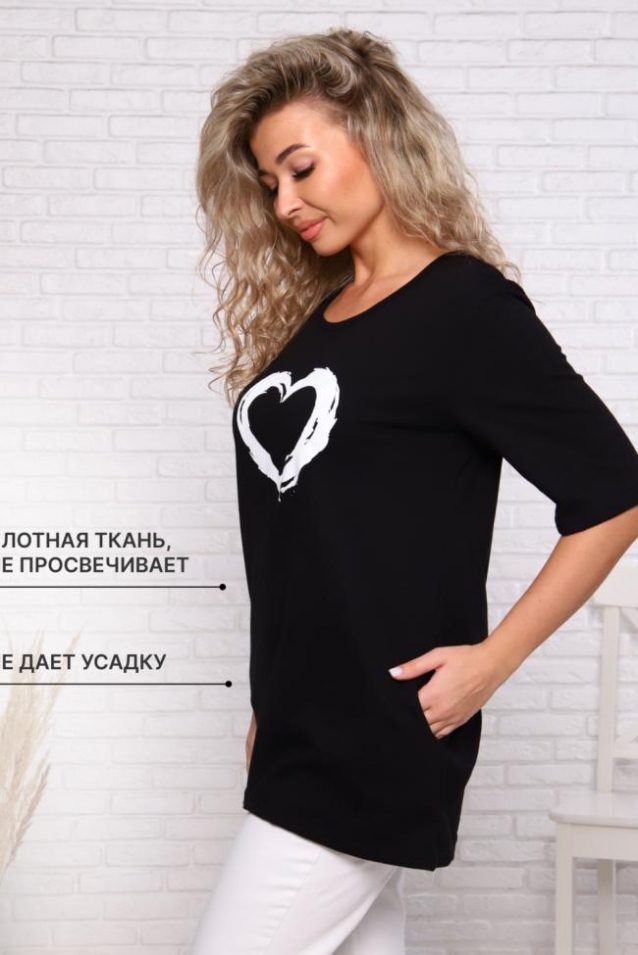 Футболка женская удлиненная с карманами и рисунком в виде сердца. Футболка с широким втачным рукавом, что делает его свободным и футболка не сковывает движений. Карманы на футболке очень практично и удобно, особенно, если носить ее с бриджима, леггинсами и велосипедками. Футболка свободного кроя из натурального дышащего хлопка - прекрасный базовый вариант одежды на любой сезон. Подходит в качестве домашней одежды, одежды на работу и для прогулок.